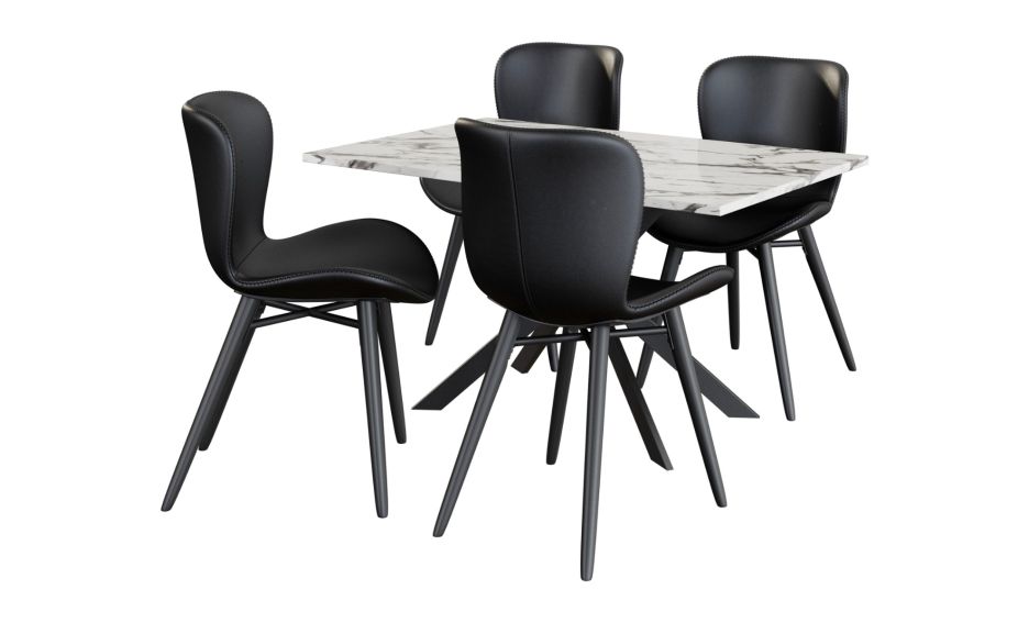 Uljepšajte svoj dom uz blagovaonski set koji se sastoji od stola Arvio s elegantnim metalnim postoljem i četiri udobne Batilda stolice. Ovaj set odiše sofisticiranošću i suvremenim dizajnom, idealno se uklapajući u moderne interijere. Ploča stola je izrađena od iverala u stilu crystal marble.