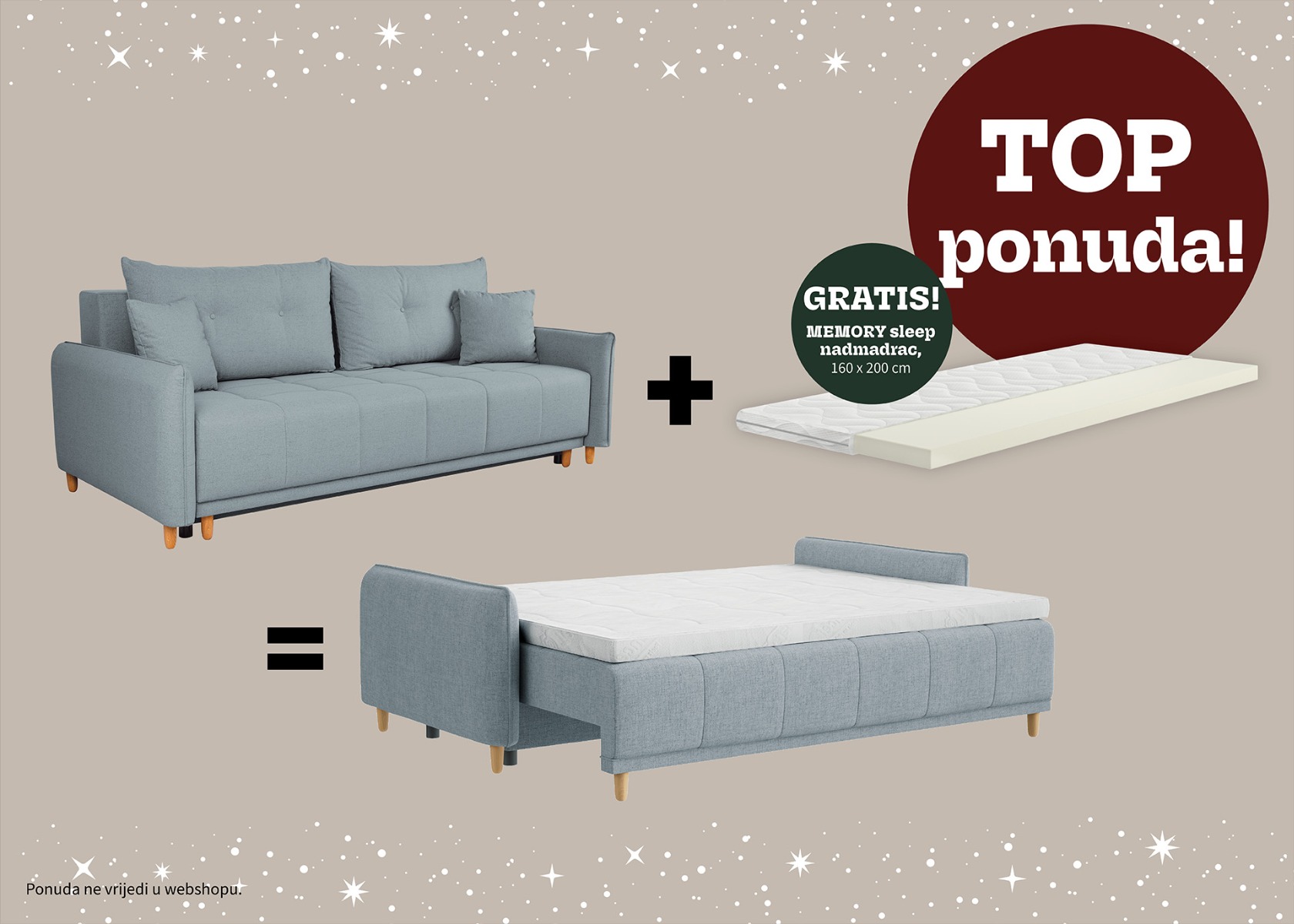 Kako biste ove blagdane proveli u velikom društvu najmilijih, za vas smo pripremili TOP PONUDU! Od 5. prosinca 2024. godine do 1.siječnja 2025. godine, uz kupovinu trosjeda na razvlačenje Lokrum, koji je sada snižen čak 40%, darujemo vam GRATIS Memory Sleep nadmadrac! Kombinacija je idealna za spavanje, samo razvucite trosjed i rasprostrite nadmadrac.