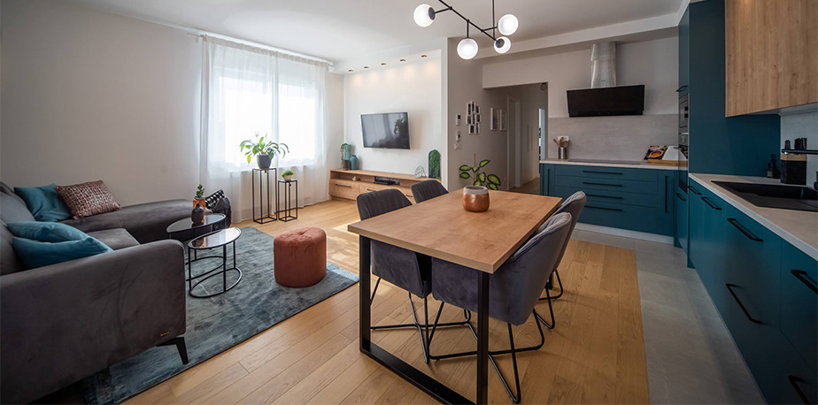 Fokus klijenata bio je na rješenju dnevnog prostora modernog otvorenog tipa u kojem kuhinja, blagovaonica i dnevni boravak čine skladnu cjelinu. Neki od glavnih zahtjeva uključivali su prostranu kuhinju s dovoljno zatvorenih elemenata i velikih radnih površina, kombinaciju sive i plave boje te metalne detalje.