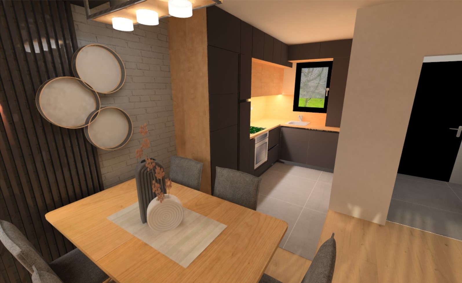 U dnevnoj zoni u prizemlju kuće, veliki dio zida zauzima staklena stijena, zbog koje je prostor bogat prirodnim dnevnim svjetlom. Dnevni prostor podijeljen je u tri cjeline - kuhinju, blagovaonicu i dnevni boravak, ali korištenjem detalja od istog materijala, boja, dekora i rasvjete sve je povezano u jednu cjelinu. Za dodatnu toplinu i profinjenost predložene su drvene letvice, koje vizualno dijele prostor na zone.