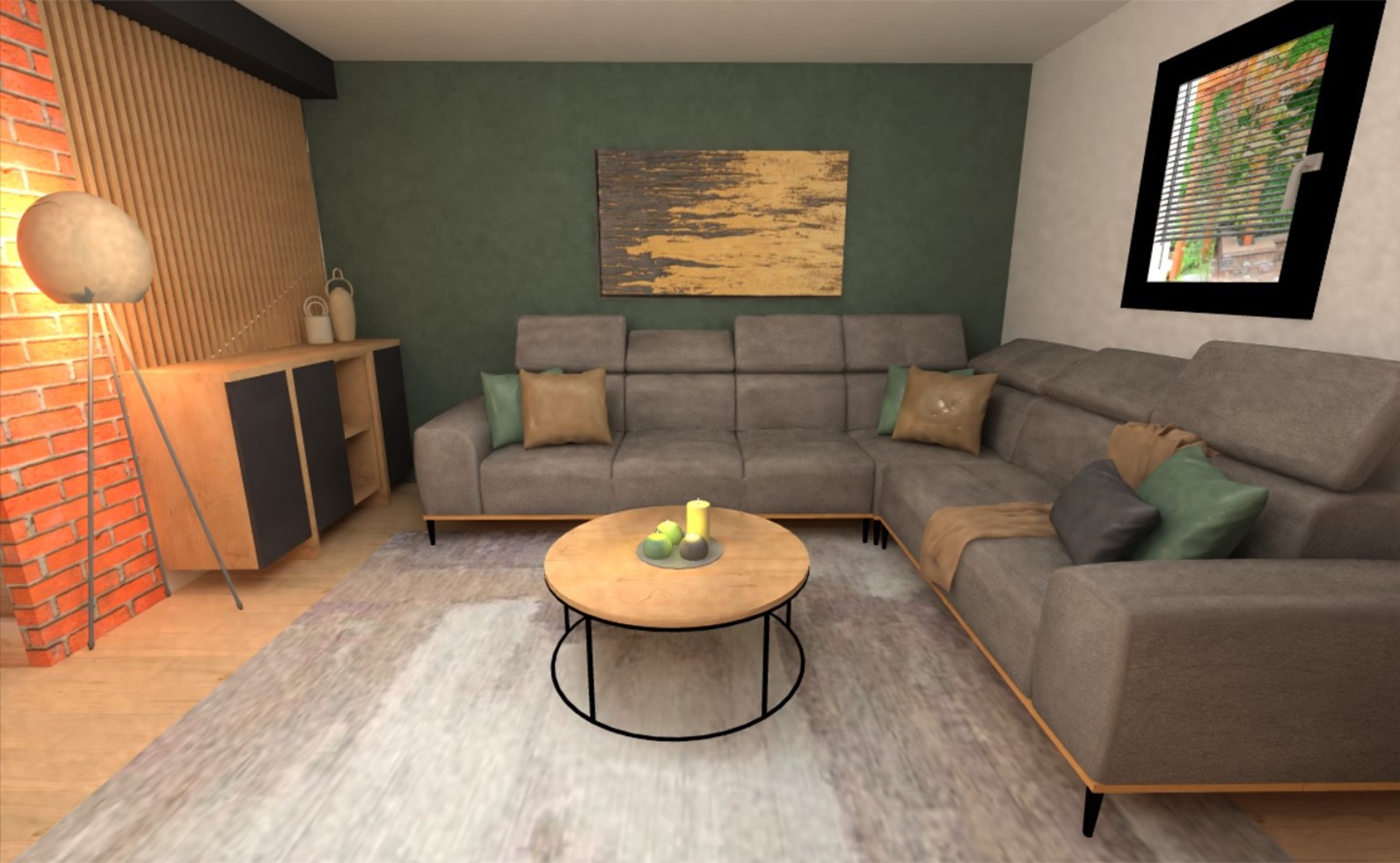 Korištenjem zelene boje u cijelom prostoru unesen je dodir prirode, dok je kroz detalje - dekoracijama u zlatnim tonovima unesena dodatna doza elegancije. Korištenjem raznih dekorativnih elemenata prostor je postao posebno zanimljiv - od uzoraka na tepihu, tapeta na zidu, ukrasnih detalja, zavjesa sve do efektne rasvjete. U vizualizaciji je maksimalno iskorištena kvadratura, a ostavljeno je dovoljno prostora kao bi dom odisao skladom.
