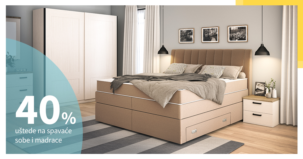 - 40% uštede na spavaće sobe i madrace! Ušteda uključuje drvene i tapecirane krevete, ormare, komode, noćne ormariće, madrace, nadmadrace, podnice, štep deke, poplune, jastuke...