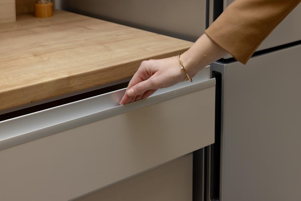 Omogućuje jednostavno otvaranje elemenata laganim povlačenjem fronte s vrha njezine unutarnje strane, a ne za ručkicu. Istovremeno štiti frontu od otisaka prstiju i olakšava održavanje te čini kuhinju vizualno jednostavnom i suvremenom.