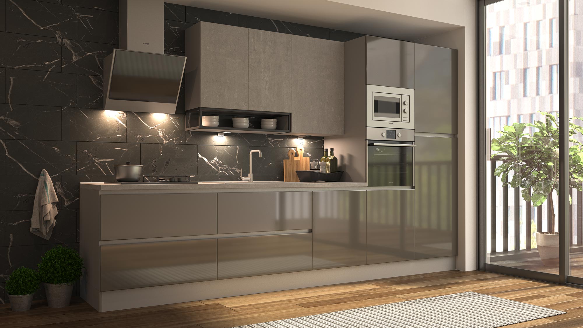 U našu ponudu kuhinja po mjeri, industrijski stil smo unijeli posebno efektnim dekorom betona i čelika za kuhinjske fronte. No, možete kombinirati i crne mat fronte s radnom pločom u betonskom dekoru.