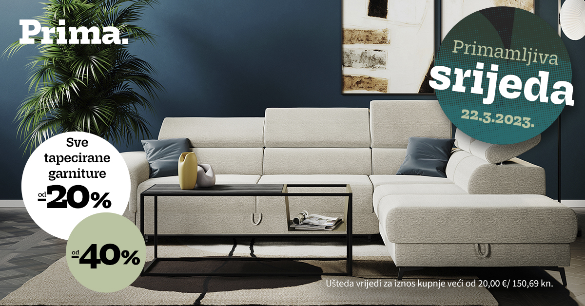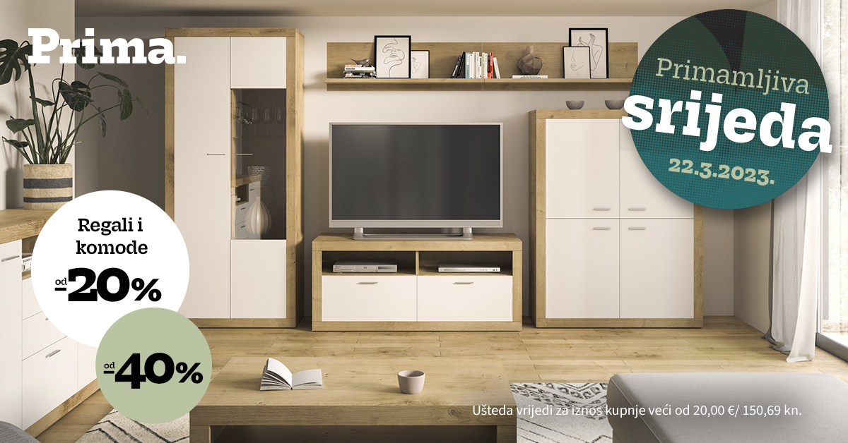*Ušteda vrijedi na dan 22.3. u Prima salonima i na webshopu. Akcije se ne zbrajaju, međusobno se isključuju i ne vrijede za artikle označene oznakom HIT u programu regala i komoda. Uštede vrijede za kupnju iznad 20,00 € / 150,69 kn.