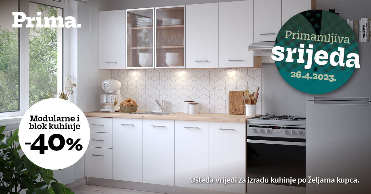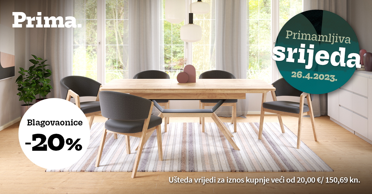 *Ušteda vrijedi na dan 26.4. u Prima salonima i na webshopu. Akcije se ne zbrajaju, međusobno se isključuju i ne vrijede za proizvode iz COCO maison asortimana i artikle označene oznakom HIT (osim blok kuhinja!). Ušteda na kuhinje vrijedi za izradu kuhinje po željama kupca. Ušteda na blagovaonice vrijedi za iznos kupnje veći od 20,00 € / 150,69 kn.