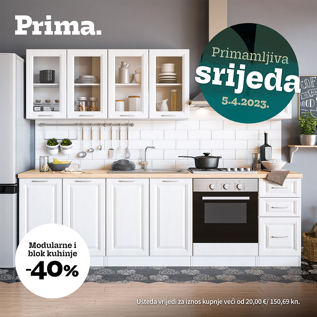 *Ušteda vrijedi na dan 5.4. u Prima salonima i na webshopu. Akcije se ne zbrajaju, međusobno se isključuju i ne vrijede za proizvode iz COCO maison asortimana i artikle označene oznakom HIT (osim blok kuhinja!). Ušteda na kuhinje vrijedi za izradu kuhinje po željama kupca. Ušteda na blagovaonice vrijedi za iznos kupnje veći od 20,00 € / 150,69 kn.