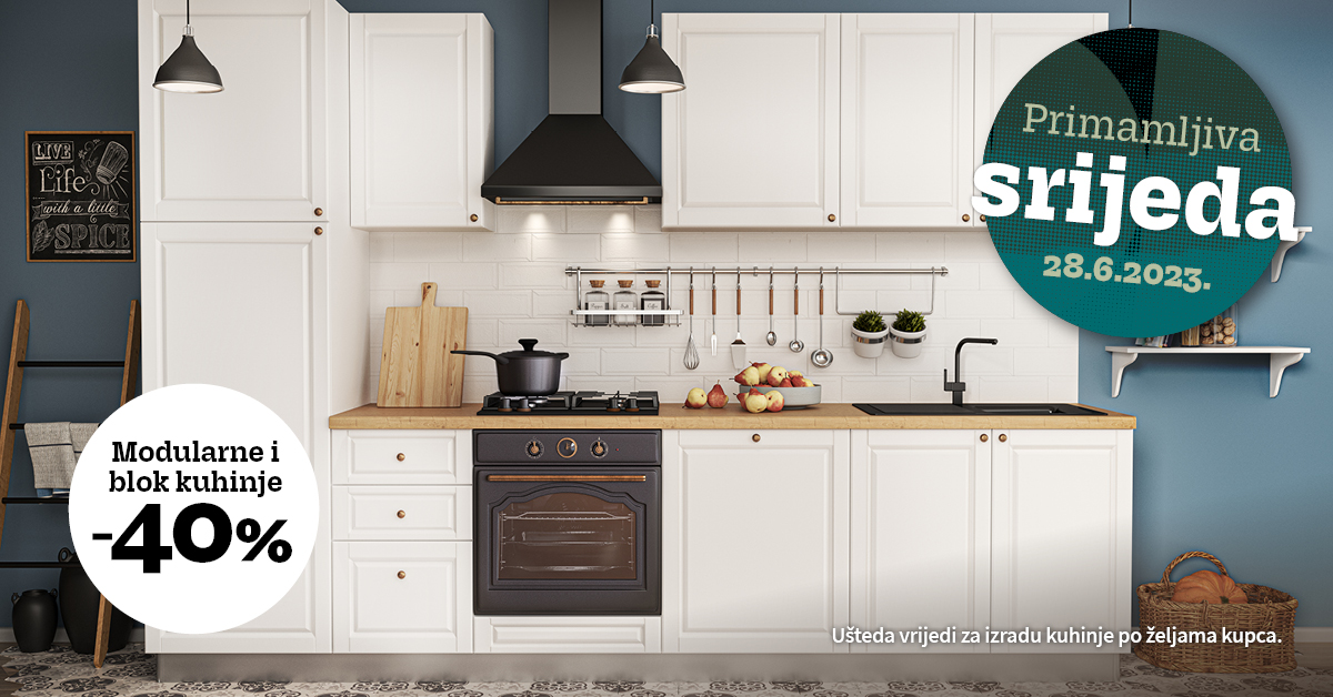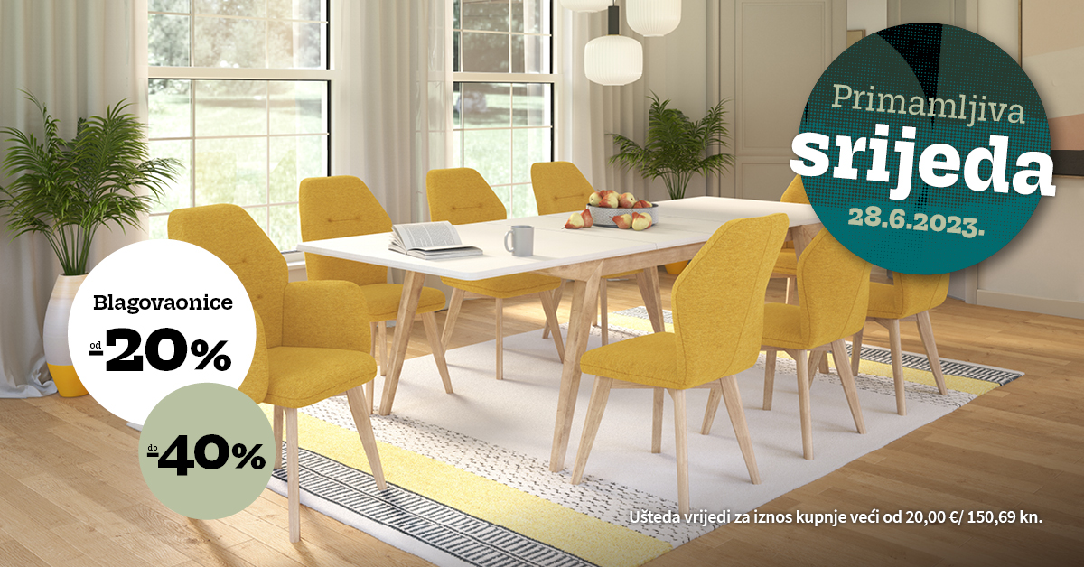 *Ušteda vrijedi na dan 28.6. u Prima salonima i na webshopu. Akcije se ne zbrajaju, međusobno se isključuju i ne vrijede za proizvode iz COCO maison asortimana i artikle označene oznakom HIT (osim blok kuhinja!). Ušteda na kuhinje vrijedi za izradu kuhinje po željama kupca. Ušteda na blagovaonice vrijedi za iznos kupnje veći od 20,00 € / 150,69 kn.