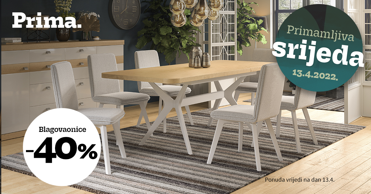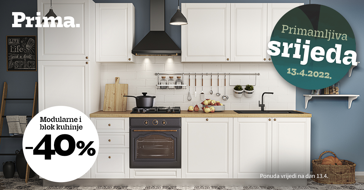 *Ušteda vrijedi na dan 13.4.2022. u Prima salonima i na webshopu. Akcije se ne zbrajaju, međusobno se isključuju i ne vrijede za proizvode iz COCO maison asortimana i artikle označene oznakom HIT (osim blok kuhinja!).
