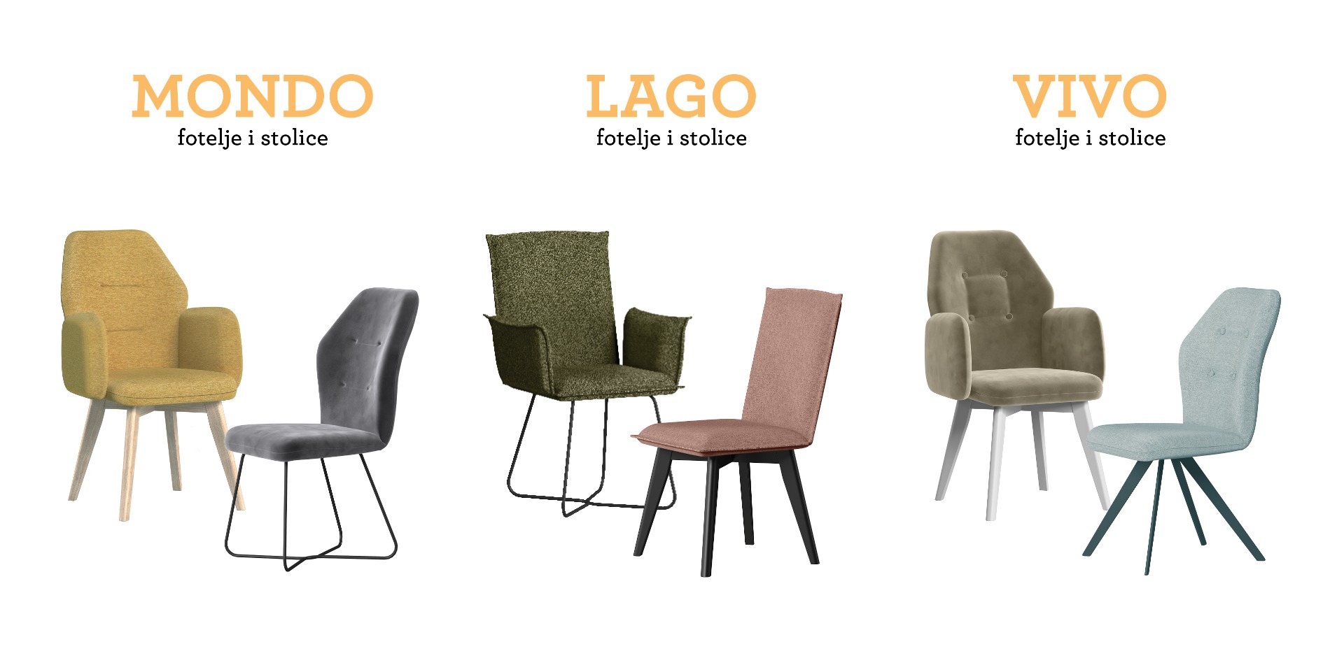 Sustav stolica Mondo, Vivo i Lago namijenjen je kupcima koji svoju blagovaonicu žele osvježiti modernim i upečatljivim komadima namještaja. Uz sam oblik sjedišta po kojima stolice nose ime, kupac može odabrati i između dvije kvalitete sjedenja - uz uobičajeno sjedište od kombinacije spužvi nudimo i sjedište s džepićastom jezgrom.