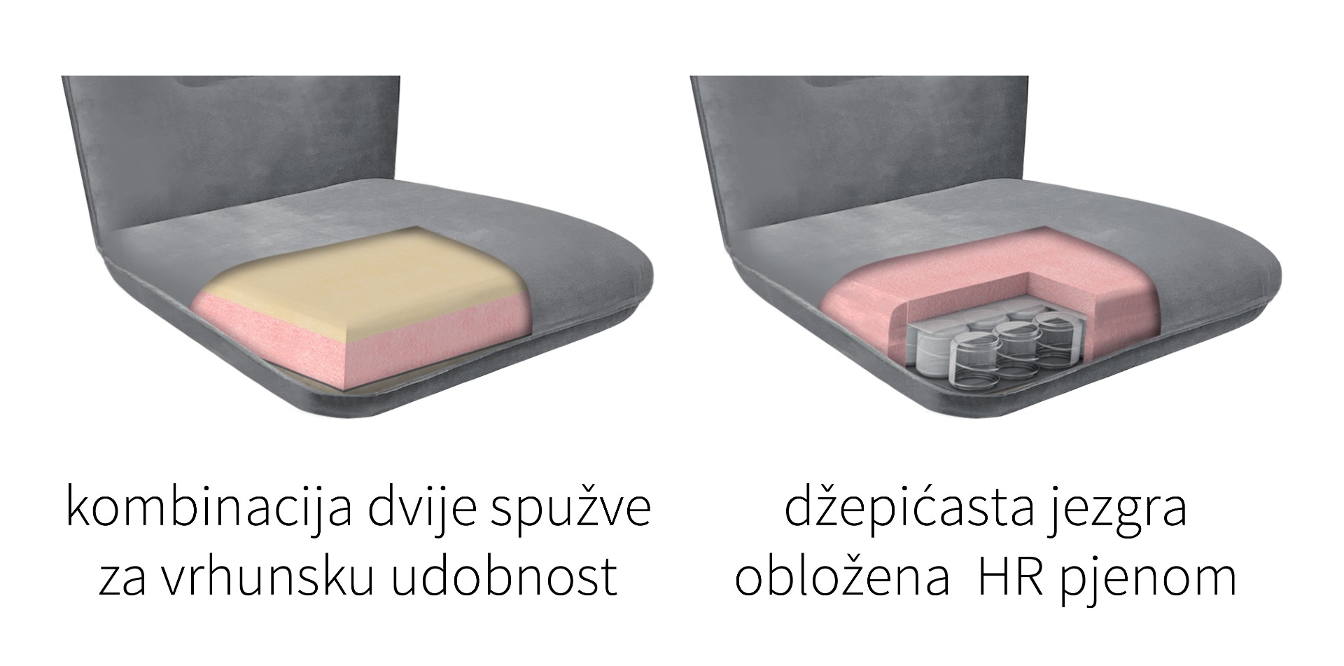 Za kupce kojima više odgovara mekoća spužve u sjedištu osmislili smo i rješenje koje kombinira dva sloja različitih gustoća hladno lijevane HR pjene, za iznimnu udobnost tijekom sjedenja. Ova visokokvalitetna pjena ima elastična svojstva i težinu osobe ravnomjerno raspoređuje na cijelu površinu sjedišta.