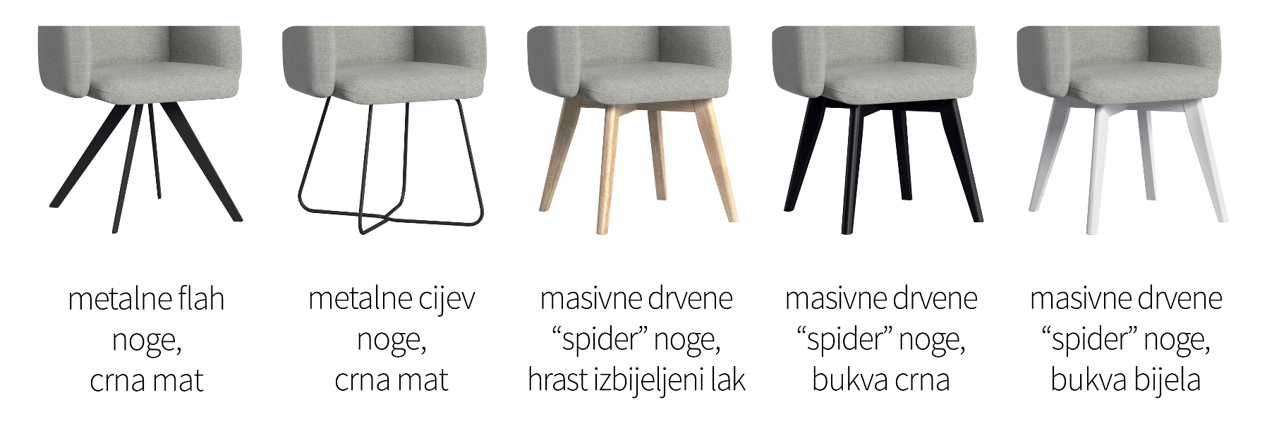 Kada odaberete oblik i kvalitetu sjedišta, fotelje ili stolice s rukonaslonima ili bez, idući korak je odabir postolja. Noge stolica mogu biti crne metalne u obliku tanke cijevi odnosno plosnatog profila, ili od masivnog drva u različitim obradama - izbijeljeni hrast lak te crno ili bijelo lakirana bukva. Važno je odabrati noge koje stilom i bojom odgovaraju nogama stola.
