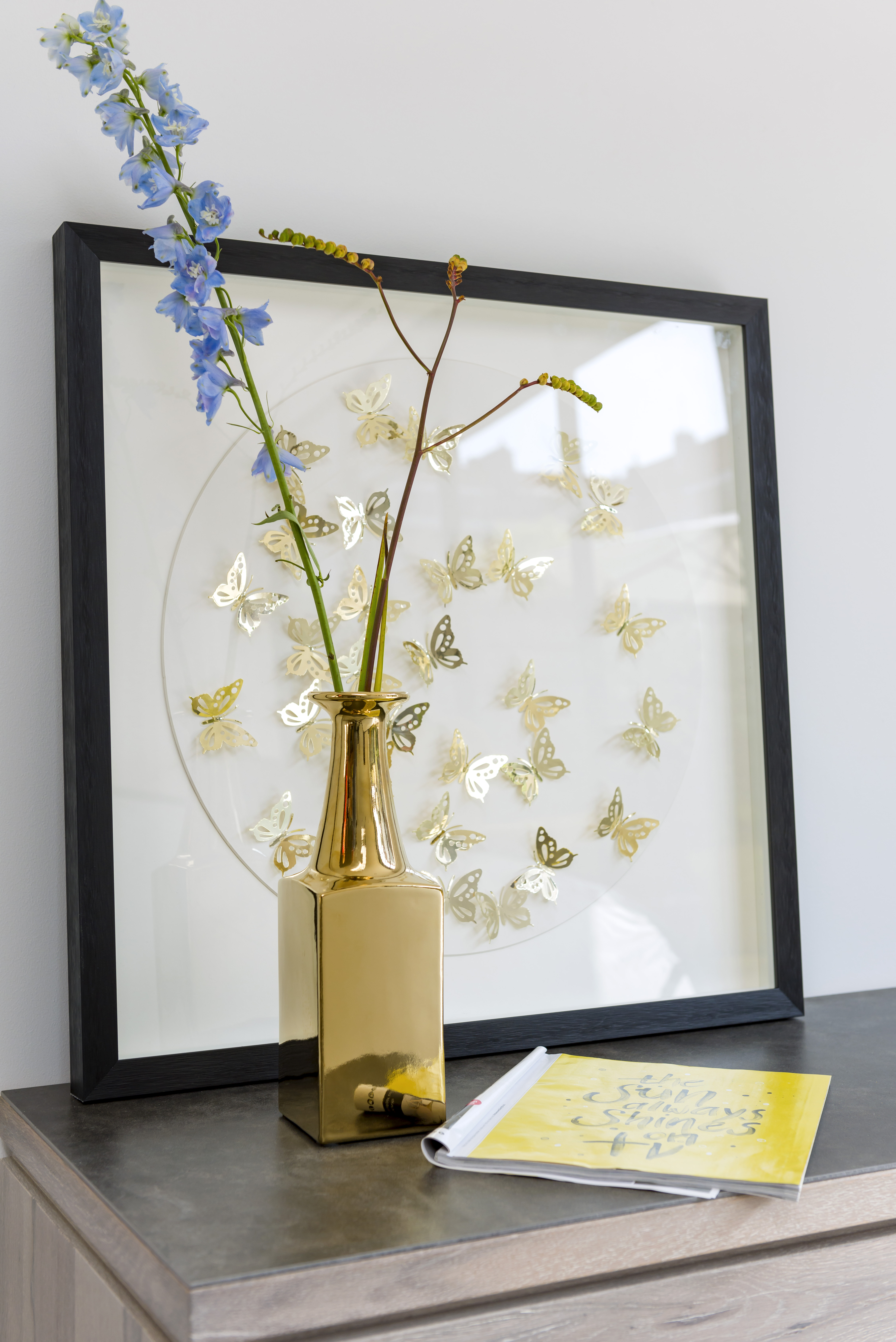 Funkcionalni zlatni predmeti, vaze ili diskretni ukrasni predmeti na radnim stolovima stvaraju sofisticiran i autoritativan izgled. Međutim, u poslovnim prostorima, ključno je da zlato bude korišteno s mjerom kako bi prostor ostao ozbiljan i funkcionalan.