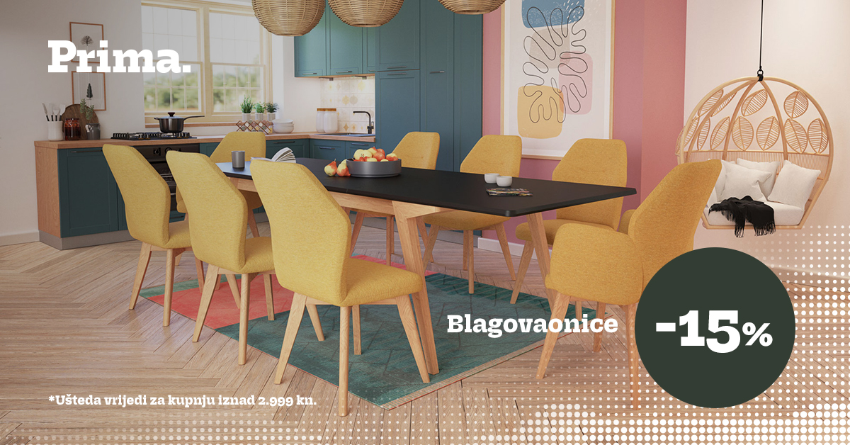 *Ušteda vrijedi od 18.8. do 23.8. u Prima salonima i na webshopu. Uštede ne vrijede za artikle označene oznakom HIT, osim blok kuhinja. Uštede za blagovaonicu vrijede za kupovinu iznad 2.999 kn/ 398€, a kod kuhinja za personaliziranu modularnu, blok ili kuhinju po mjeri.