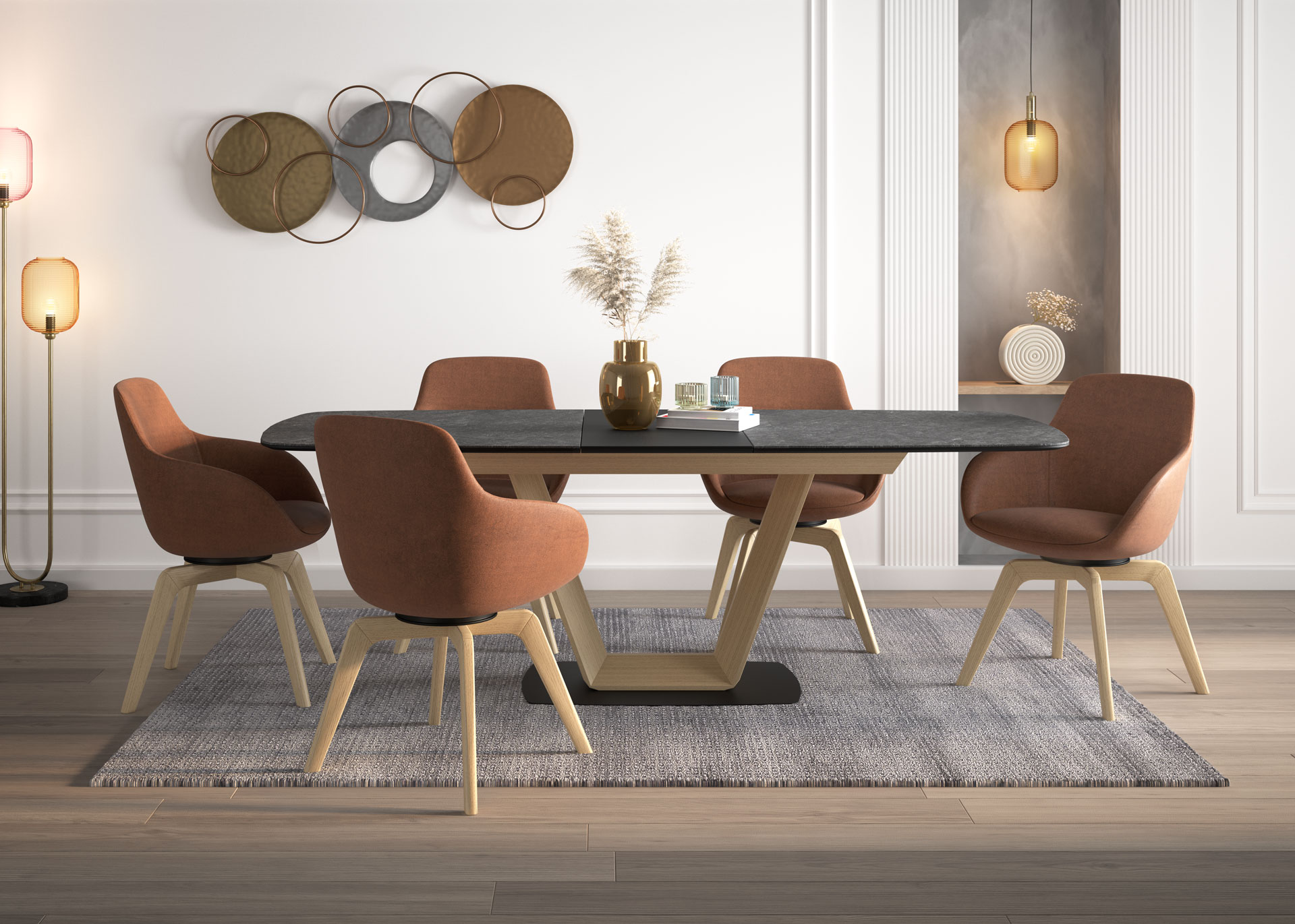 Moderni program Tarin čine fotelje i stolice s nevjerojatno udobnim sjedištem od poliuretanske pjene te razvlačni stol s estetski upečatljivom pločom od mramora ili masivnog drva bukve. Elementi blagovaonskog programa Ordos, fotelje i stol, prepoznatljivi su po suptilno zaobljenim linijama koje su trenutačno veliki trend u svijetu interijera. Dobro je znati da su sve stolice i fotelje dostupne u više varijacija boja i materijala.