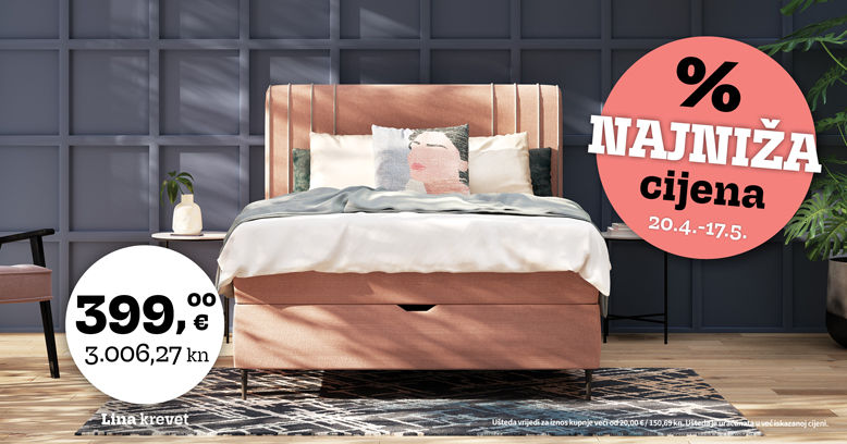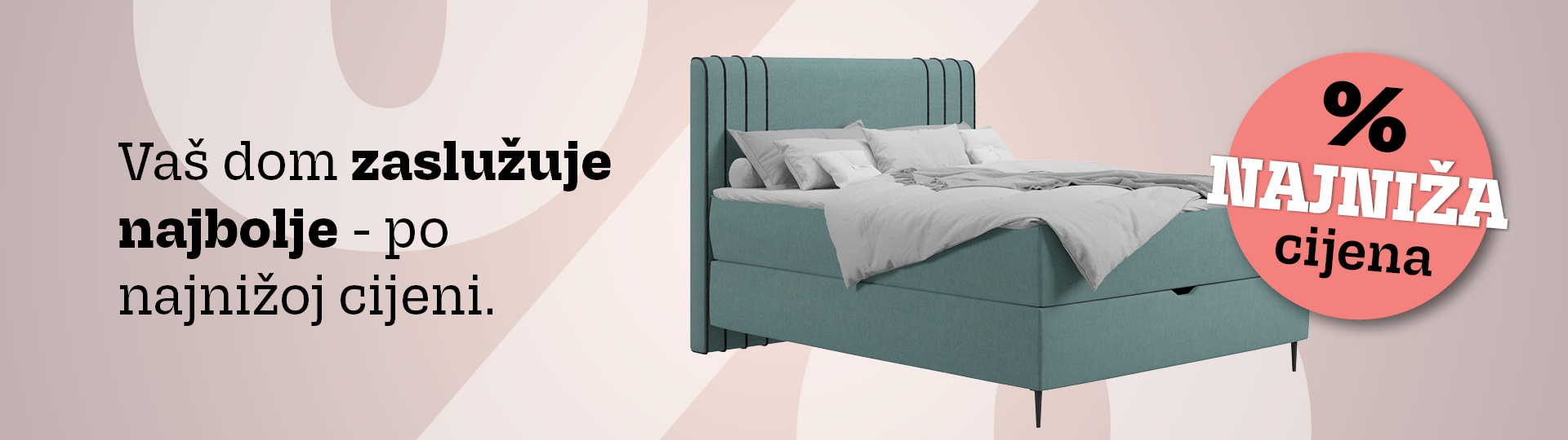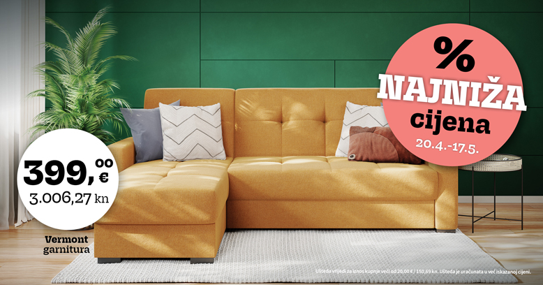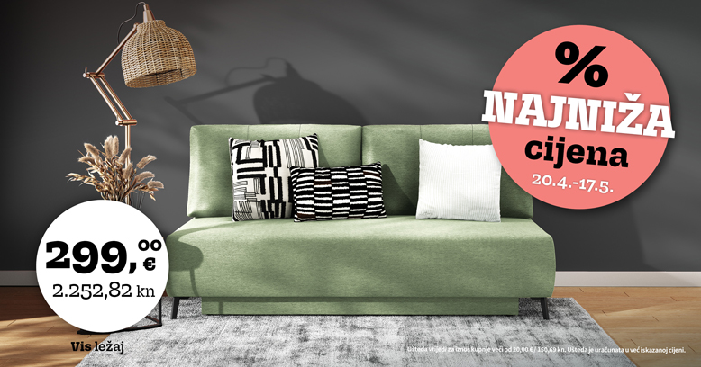Zato smo kreirali posebnu ponudu proizvoda za opremanje interijera s golemim uštedama. Neke od najprodavanijih komada namještaja iz našeg stalnog asortimana sada možete kupiti po znatno nižim cijenama. Ova posebna ponuda nosi jednostavan, jasan i direktan naziv – Najniža cijena, a uključuje čak više od 100 proizvoda kojima možete vrlo povoljno opremiti gotovo svaku prostoriju vašeg doma. Dnevnu sobu možete opremiti garniturama, razvlačnim ležajevima, komodama, regalima, visećim elementima, klub stolovima koji su sniženi do 40%, a spavaću sobu opremite krevetima i proizvodima iz programa spavanja na kojima možete uštedjeti do 52%.