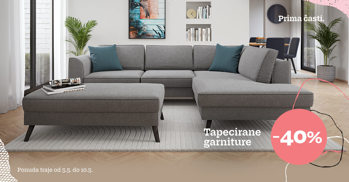 - 40% uštede na tapecirane garniture (modularne garniture, kutne garniture, preklopni ležajevi, kožne garniture, dvosjedi, trosjedi i fotelje…)