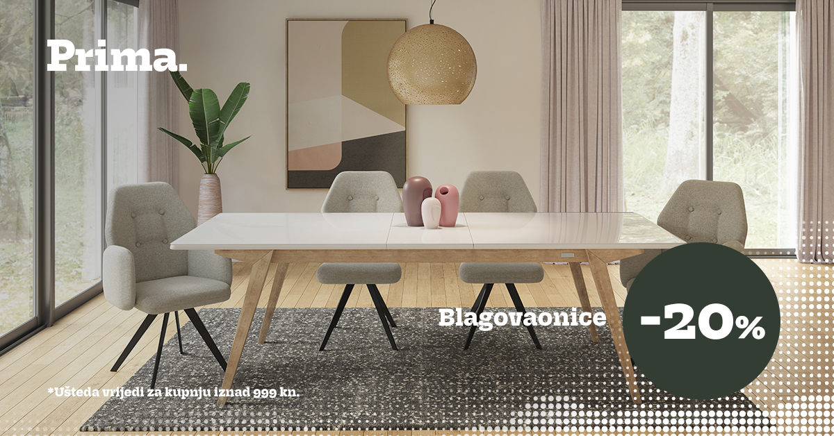 - 20% uštede na blagovaonice (stolovi, stolice, blagovaonske fotelje, bez HIT asortimana) - *Ušteda vrijedi za kupnju iznad 999,00 kn/132,59 eur