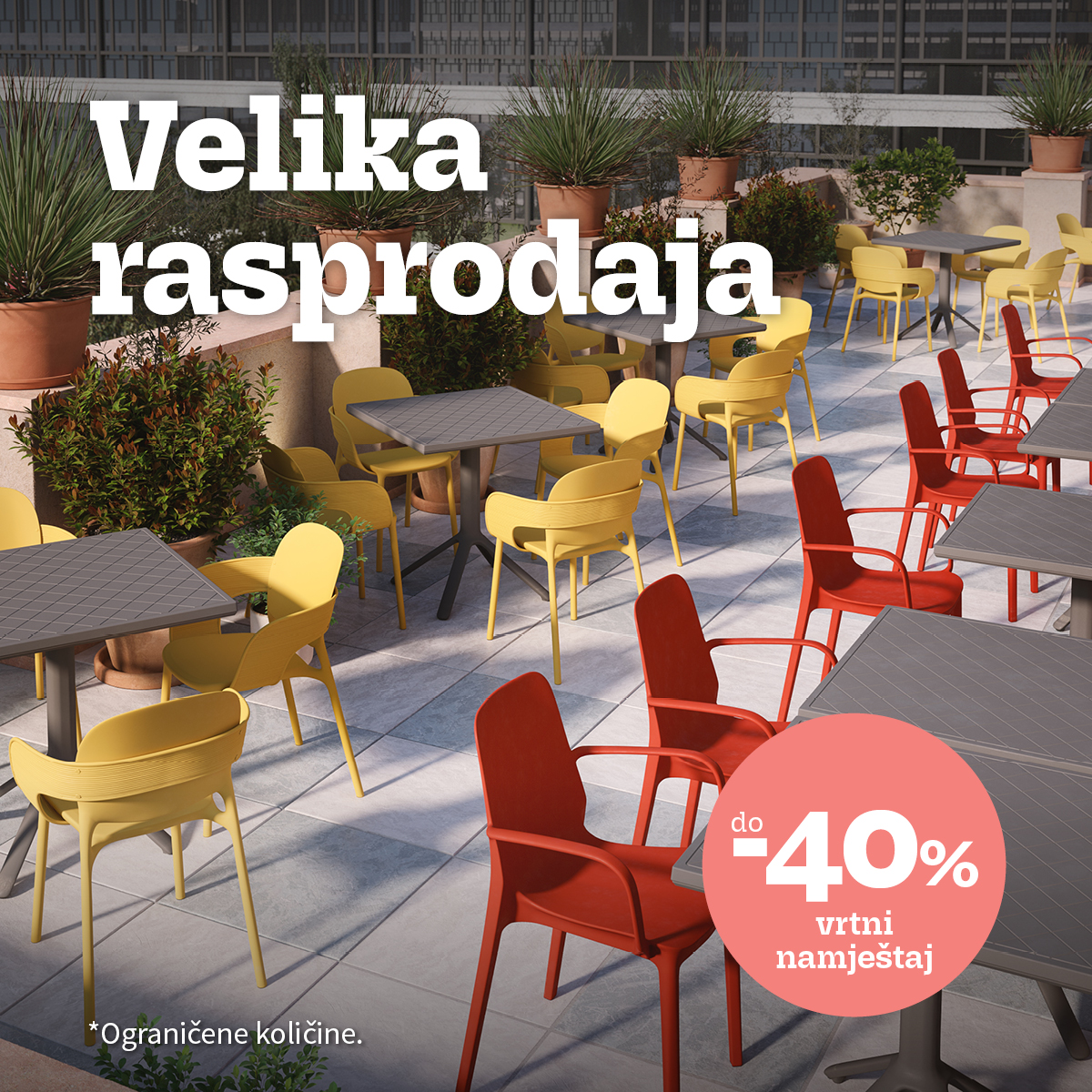 Još uvijek nije kasno za uređenje vašeg dvorišta, vrta, terase ili balkona napravljen od izdržljivih materijala. Uhvatite veliku rasprodaju vrtnog namještaja i pretvorite svoju terasu u savršeno mjesto za opuštanje i druženje uz moderan vrtni namještaj snižen do 40%.