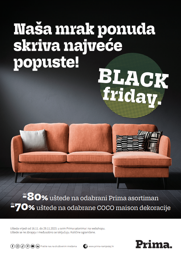 Ako slučajno niste stigli na veliko otvorenje, dobra vijest je da još uvijek stignete ugrabiti fenomenalne Black Friday uštede, bilo da kupujete u novom salonu u Puli ili u bilo kojem drugom Prima salonu diljem Hrvatske.
