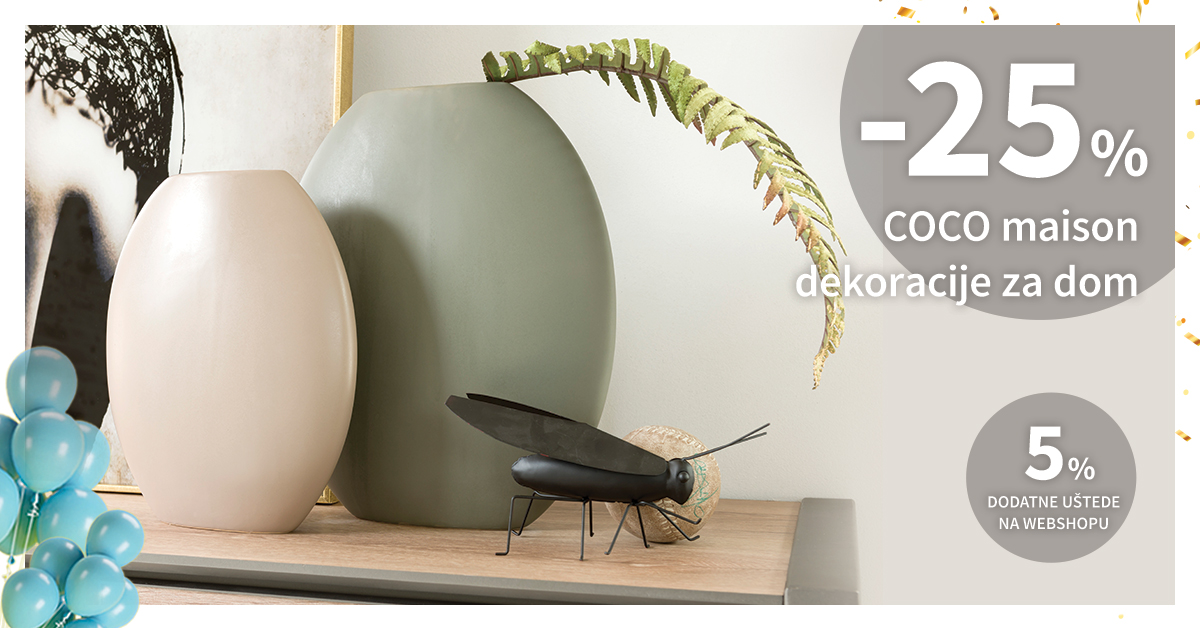 - 25% uštede na dekoracije za dom COCO maison i dodatnih 5% uštede za narudžbe dekoracija iz COCO maison kolekcije preko webshopa