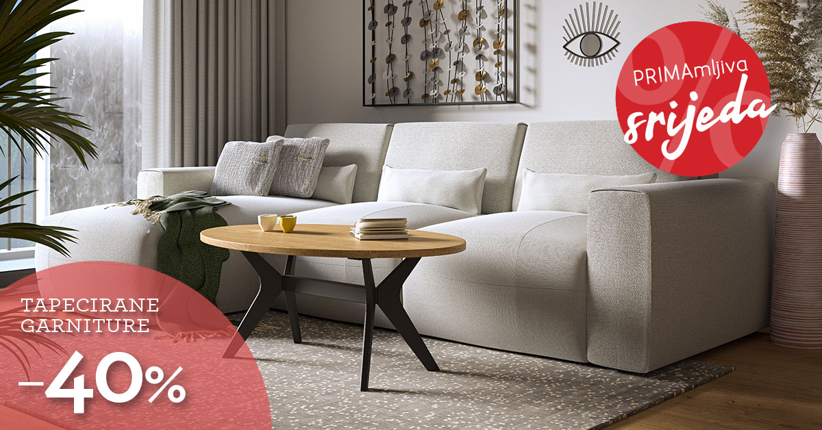 tapeciranim garniturama i krevetima uz 40% uštede*. Očekuje Vas širok asortiman tapeciranog namještaja vrhunske kvalitete u svim PRIMA salonima i na webshopu.