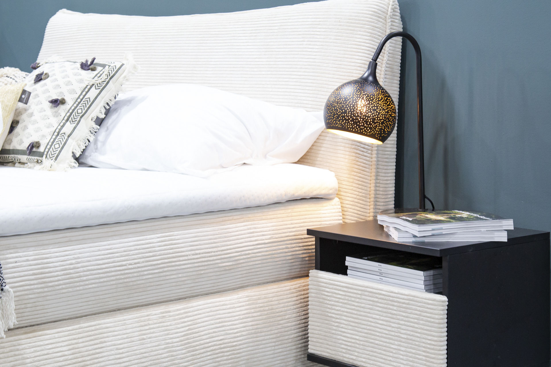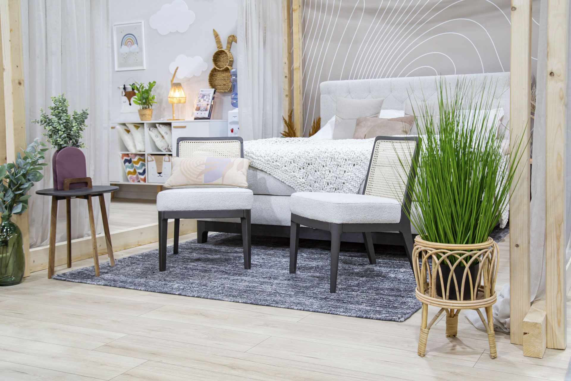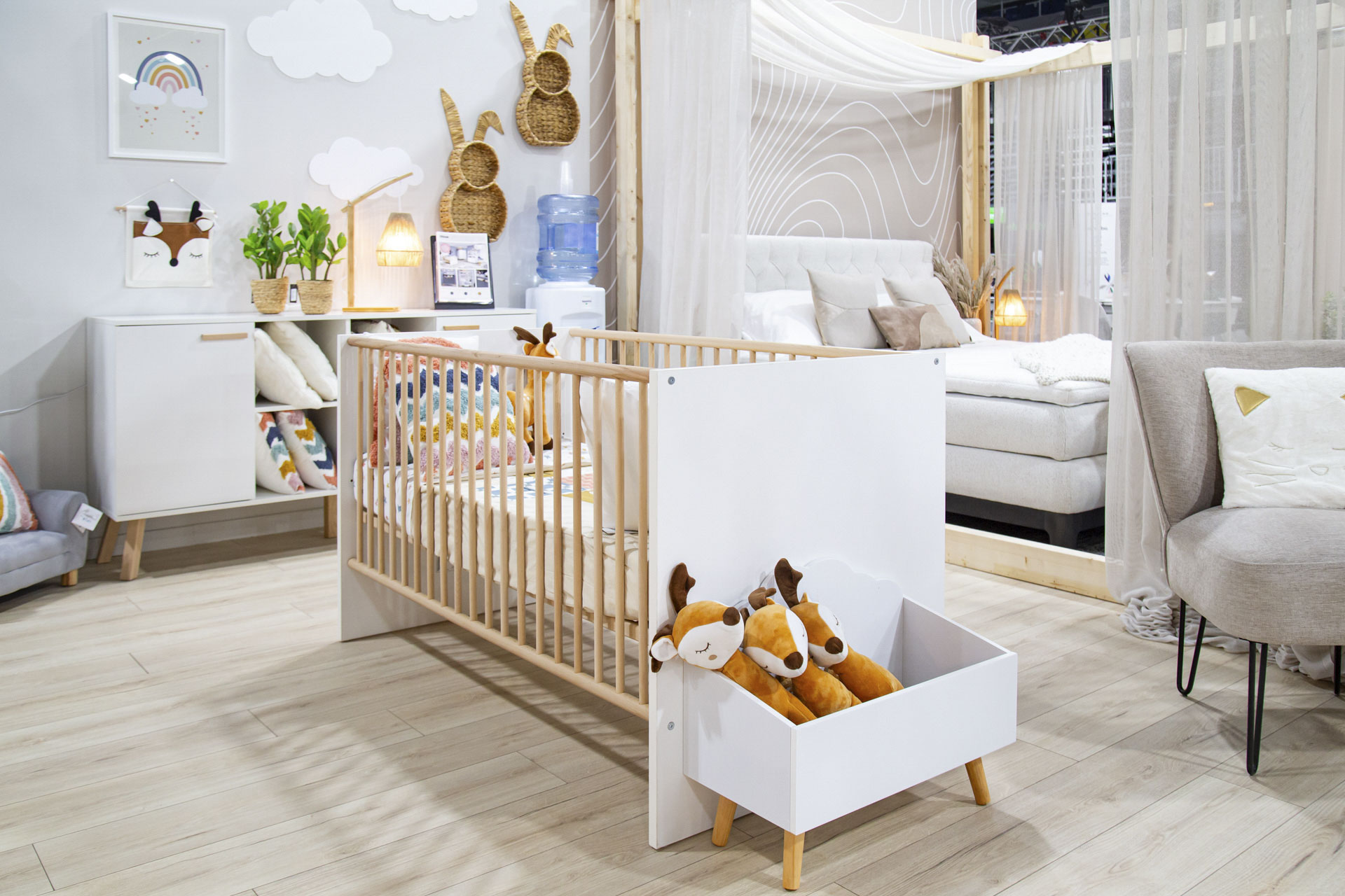 Fokus dnevne sobe koja se isticala prirodnim notama bila je premium modularna garnitura Monnalisa, a budući da se Prima na tržištu već istaknula svojim namještajem za opremanje soba za djecu i mlade, u sklopu boho interijera na InDizajnu je predstavljena sobu za bebe koja nosi prikladno nježan naziv – Oblak. Uređena je u boji bijeloj poput oblaka, a toplinu u ovu slatku sobu unose detalji u prirodnoj boji drva te dekoracije napravljene od prirodnih materijala, poput zidnih polica od pletenog pruća u obliku zečića.