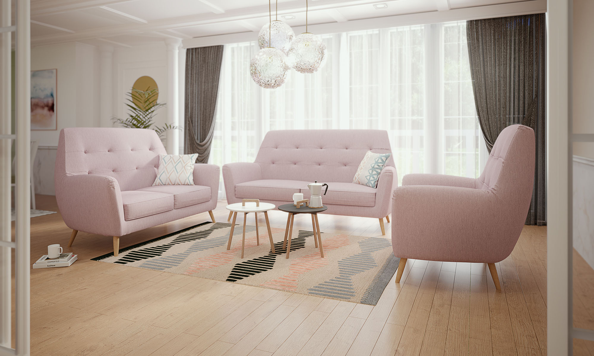 U Prima ponudi možete pronaći trosjed, dvosjed i fotelju Gea u roza tkanini Carlos 28