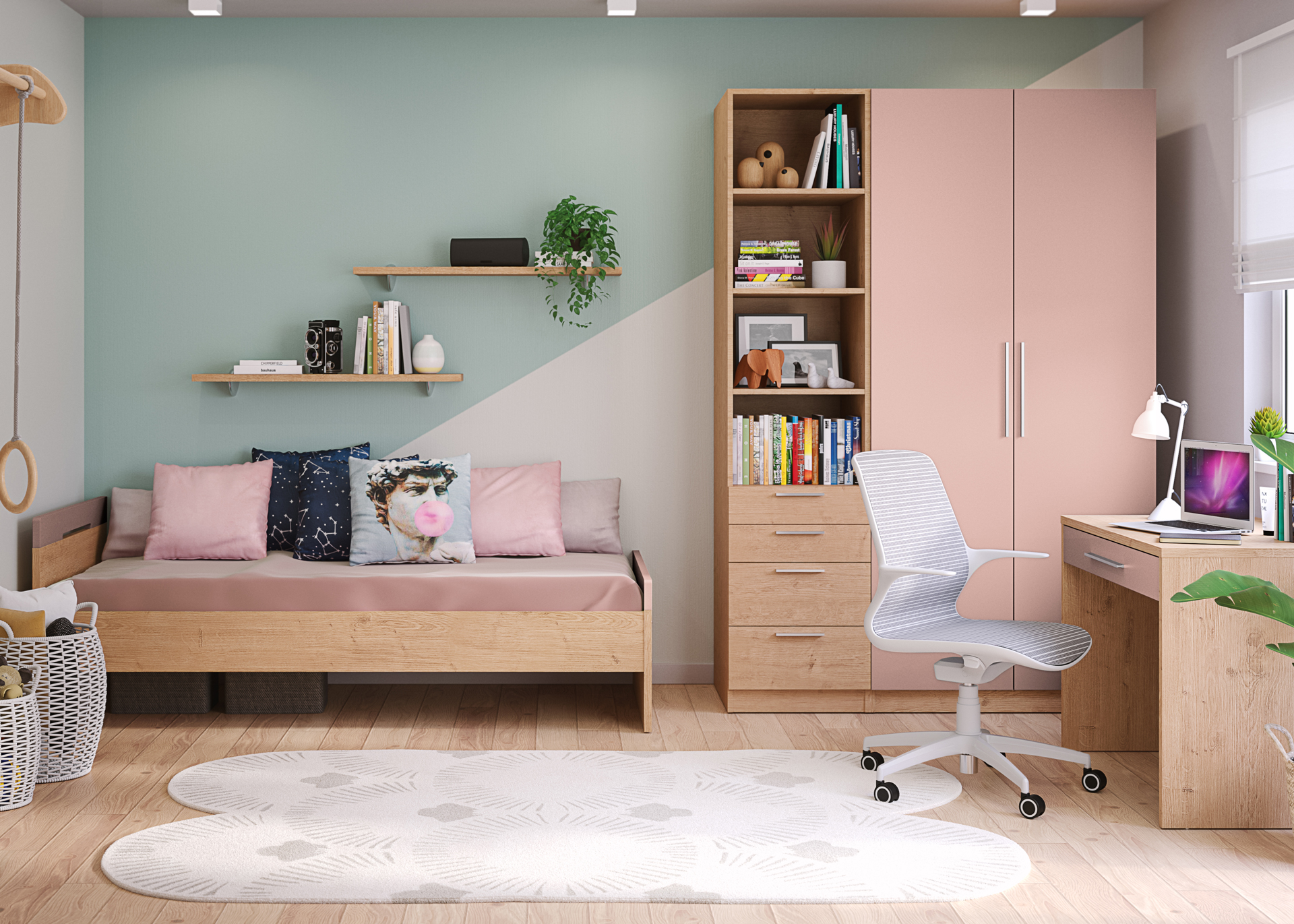 Soba za mlade Teens u kombinaciji dekora u roza boji i u prirodnom drvu