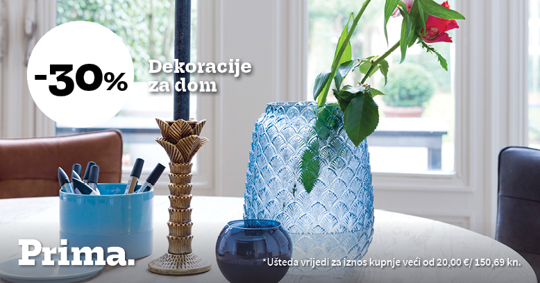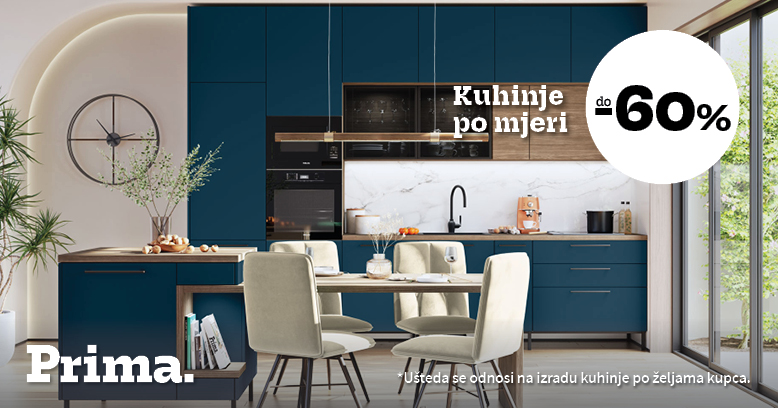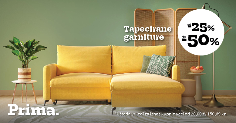 *Ušteda vrijedi od 20.7. do 31.7. u Prima salonima i na webshopu. Ušteda za tapecirane garniture i dekoracije vrijedi za iznos kupnje veći od 20,00 € / 150,69 kn. Ušteda za kuhinje po mjeri odnosi se na izradu kuhinje po željama kupca. Akcije se ne zbrajaju i međusobno se isključuju.