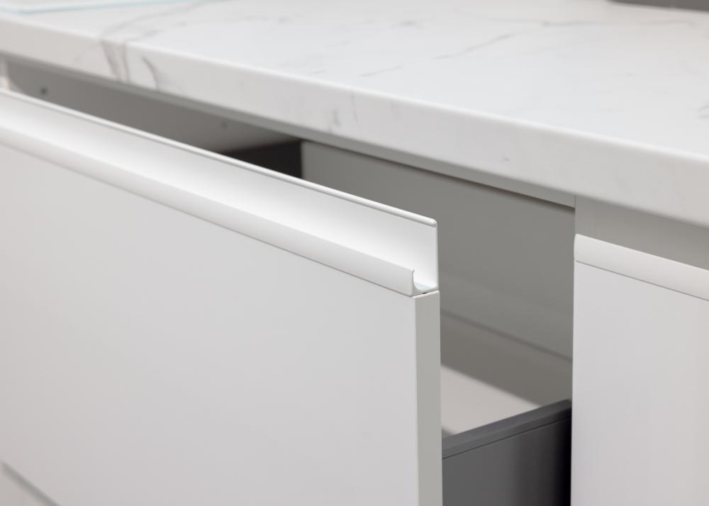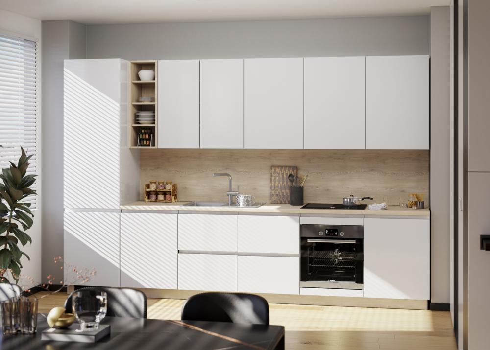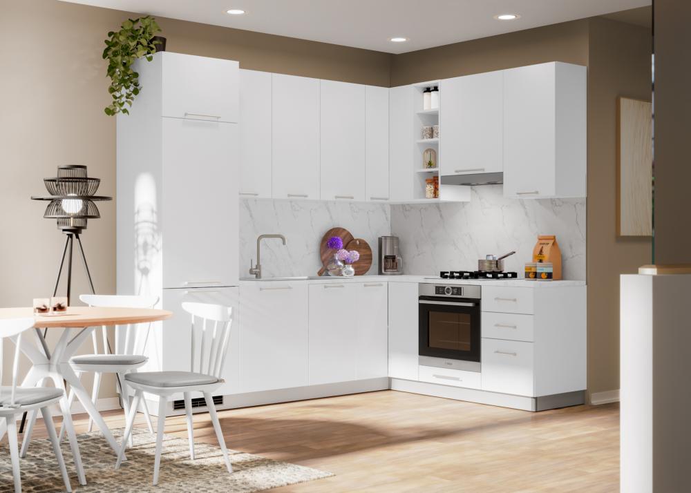 Kristalno bijela boja u kuhinji stvara osjećaj čistoće, reda i smirenosti. Vizualno otvara prostor, reflektira svjetlost te čini kuhinju većom i prozračnijom. Psihološki djeluje umirujuće, neutralno i organizirano – savršeno za prostor u kojem provodimo puno vremena.