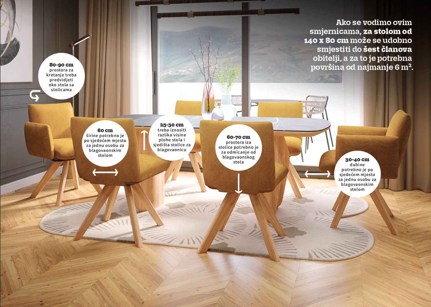 Ovi detalji pomoći će vam odabrati savršeni stol i stolice koji će zadovoljiti sve vaše potrebe. Ako se vodite ovim standardnim smjernicama, za stol dimenzija 140 x 80 cm moći će se udobno smjestiti do 6 ljudi, a za to će vam biti potrebna površina od najmanje 6 kvadrata.