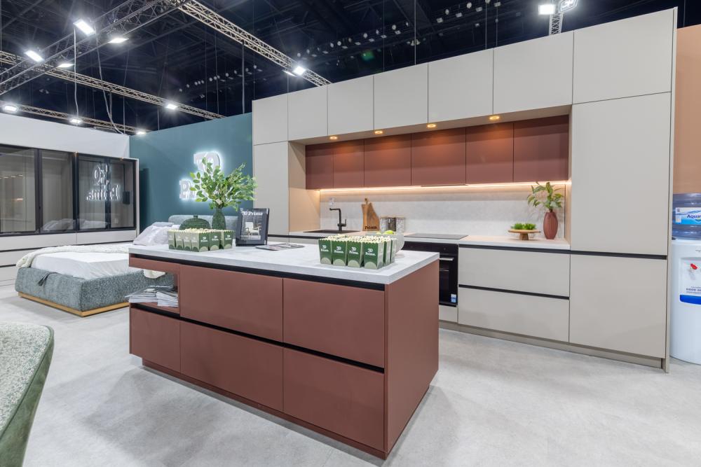 Centralna pozicija pripala je kuhinji po mjeri – modelu Liberta Next. Riječ je o savršenom primjeru Prima dizajna i proizvodnje, izrađenom od vrhunskog medijapana u kombinaciji nježnog kašmira i modernog acai dekora. Unutrašnjost odiše luksuzom svijetlog tekstilnog dekora, koji nije samo vizualno atraktivan, nego i teksturiran na dodir. Posjetitelji su je ocijenili kao kuhinju koja podjednako osvaja stilom i praktičnošću, baš onako kako se od kuhinje po mjeri i očekuje.