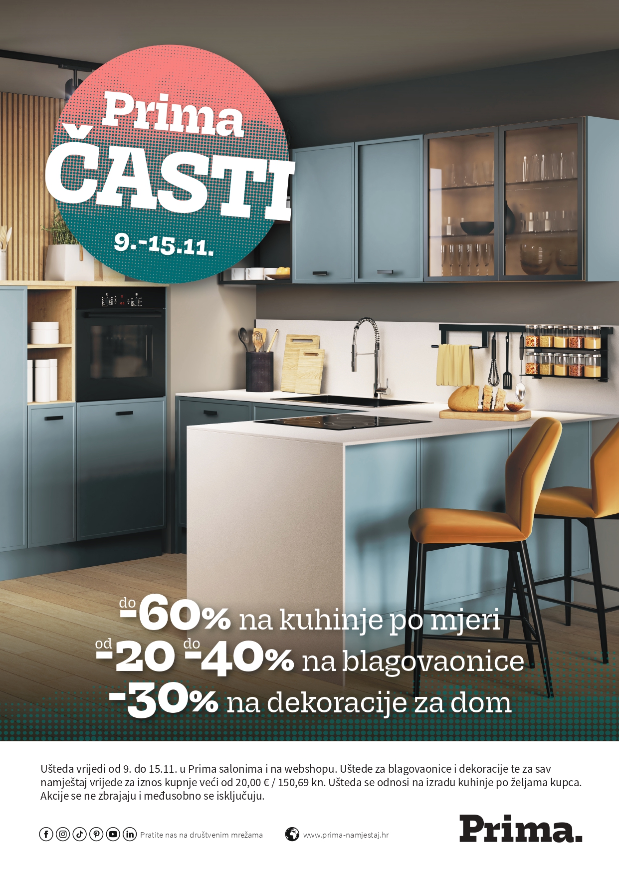 Posjetite nas i vi u Prima salonu Pula te opremite dom ili vikendicu po 100% svojoj mjeri. Uvjerite se u najbolju kvalitetu, estetiku i najpovoljnije cijene te posjetite pulski Prima salon na adresi Industrijska ulica 13 gdje će vas dočekati prodajni savjetnici koji će vam pomoći pri odabiru namještaja i dekoracija po mjeri i stilu vašeg doma. Inspiraciju za uređenje doma možete pronaći u najnovijem letku te na Prima službenom Facebook, Instagram, TikTok i Pinterest profilu.