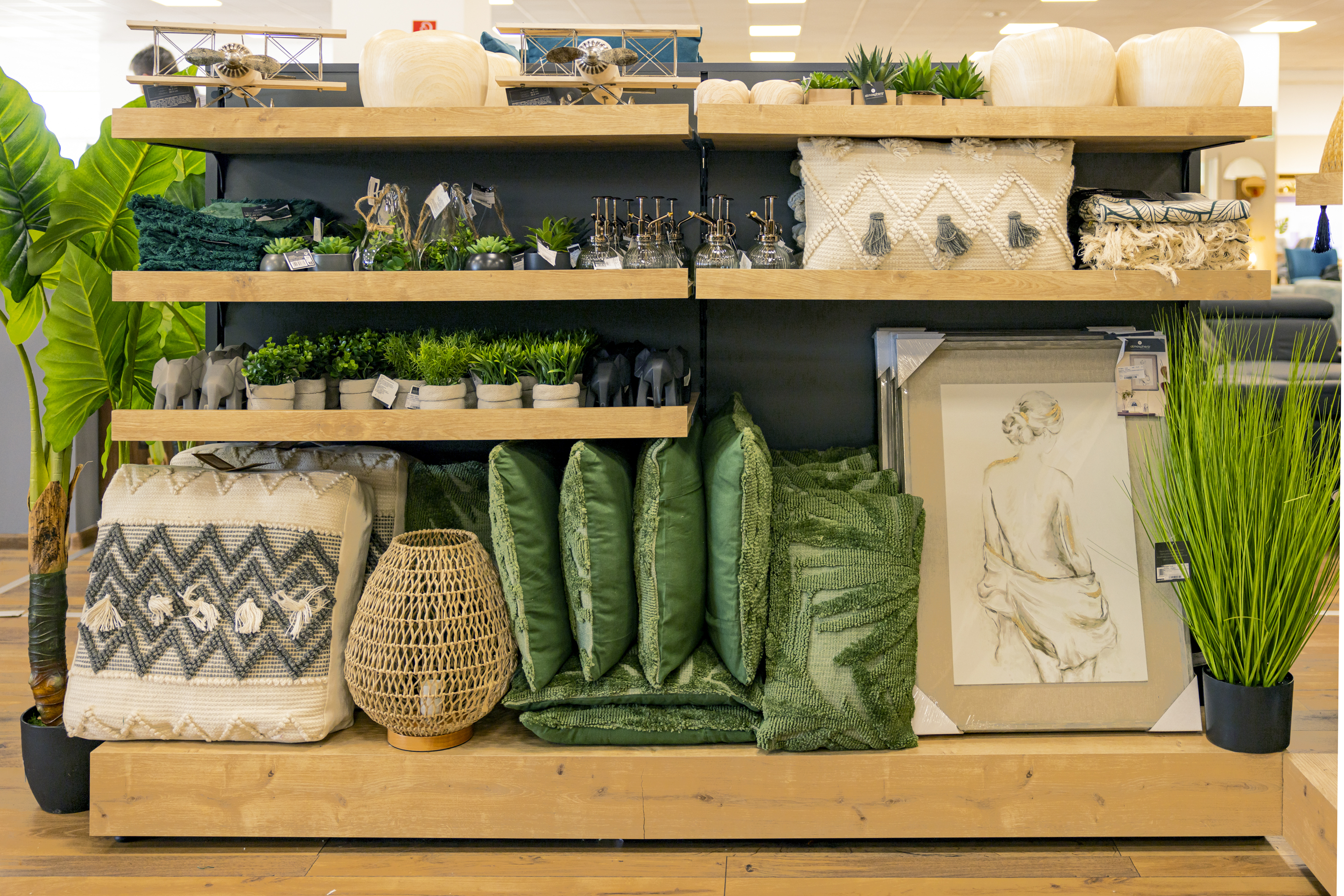 Od ulaza, kupce u prizemlju mogu razgedati asortiman kuhinja i blagovaonica, bogatu ponudu tapeciranog namještaja i regala za dnevne sobe te prošireni asortiman kupaonica. Na katu će kupci moći pronaći sve za opremanje spavaćih soba, ali i onih za djecu i mlade. Tu se nalazi i namještaj za predsoblja, kao i moderan uredski asortiman.