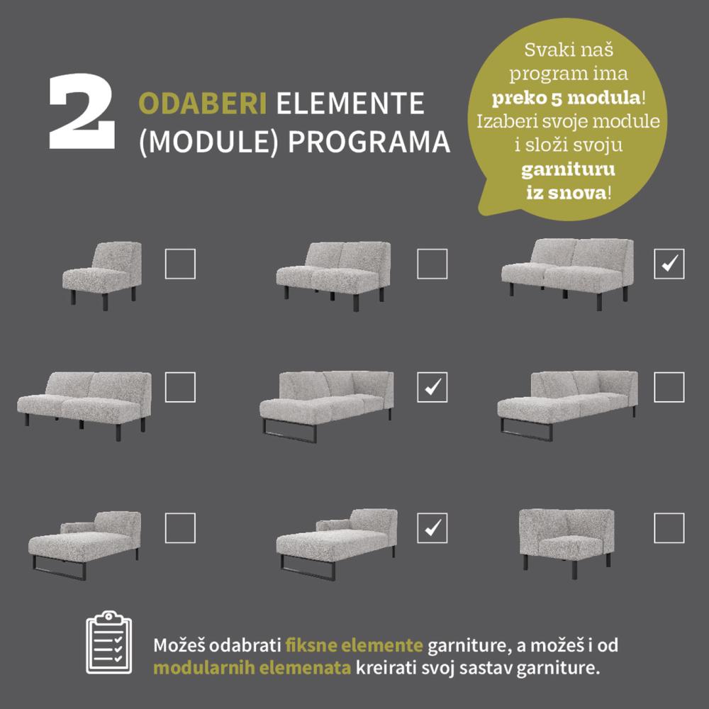 Ako vam se više sviđa trosjed koji stoji sam za sebe i nije dio nije nekog većeg sastava, i to je opcija. Samo onda ne tražite modularne elemente, nego fiksne. To su trosjed, dvosjed, počivaljka, fotelja i tabure koji se mogu zasebno kupiti, a još bolje funkcioniraju u setu. To nisu modularni elementi, ali sjajno se uklapaju u dnevne sobe. Sve je stvar vaših želja i prostora.