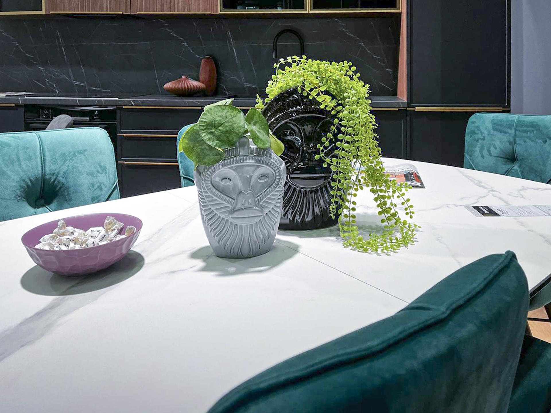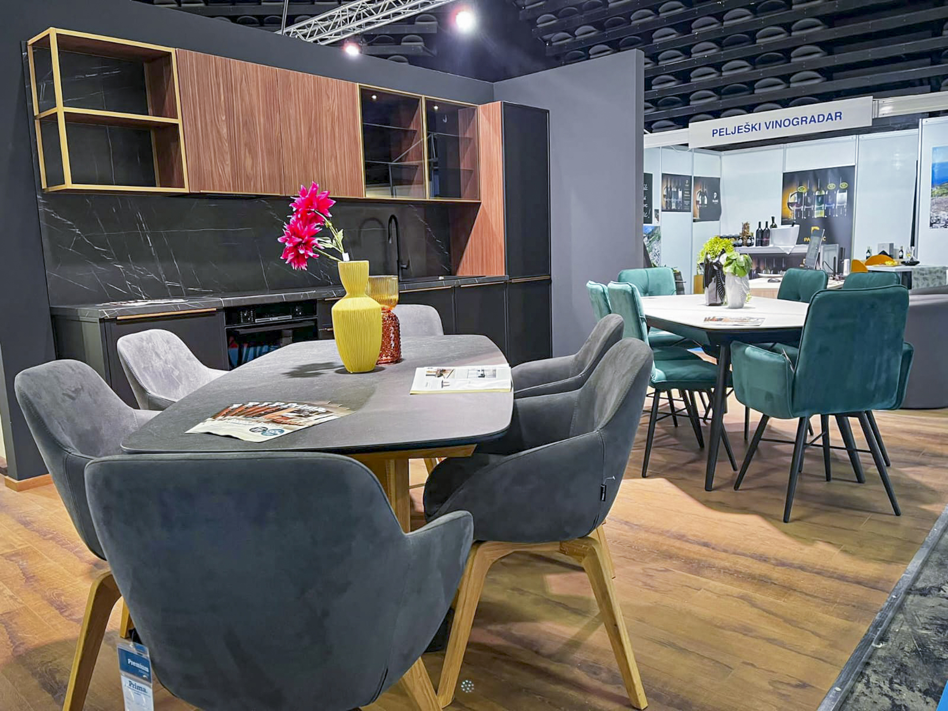 Posjetitelji su mogli vidjeti nove premium kolekcije kuhinja po mjeri poput naše nove Linde u crnom dekoru sa zlatnim detaljima koja će se uskoro naći u ponudi. Od noviteta iz blagovaonskog programa Tarin Neo stol s pločom koja je nadahnuta mramorom i Tarin stolice u smaragdno zelenoj boji izazvale su posebno oduševljenje posjetitelja.