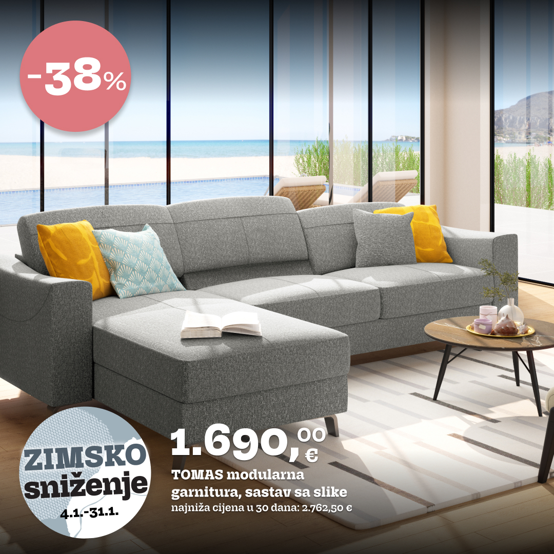 Osim svakodnevnog uživanja, kutna garnitura Tomas obogaćena je funkcijom razvlačenja s ugrađenim udobnim madracem idealnim za svakodnevno spavanje te prostorom za odlaganje. Ovisno o položaju dnevne sobe i vašem stilu, Tomas je dostupan u opciji s lijevim ili desnim kutom, a uživanje je zajamčeno i uz podesive leđne naslone.