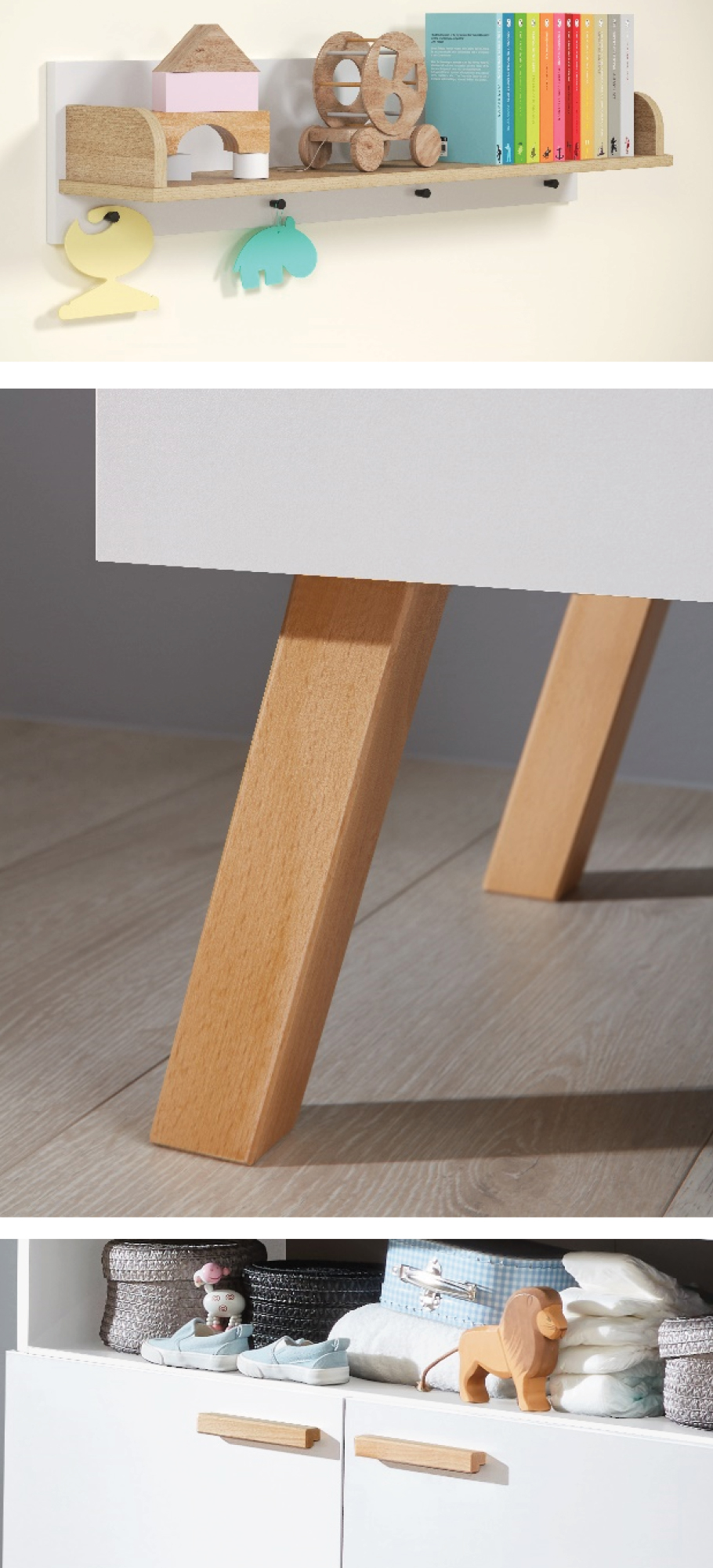 Namještaj ima čvrstu strukturu i izrađen je od kvalitetnog bijelog ili sivog iverala, ovisno o vašem odabiru, s detaljima od drvenog masiva u prirodnoj boji kao što su čvrste nogice od masivnog drva bukve.