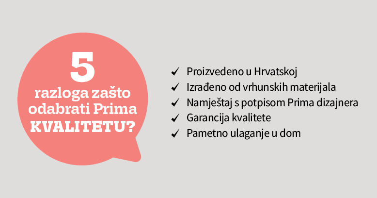 Kvaliteta proizvoda jedan je od najvažnijih kriterija pri odabiru namještaja, a Prima kvaliteta garantira vam dugotrajnost, funkcionalnost i estetiku. Više od 5 milijuna zadovoljnih kupaca u 30 godina najbolji su dokaz garancije Prima kvalitete.