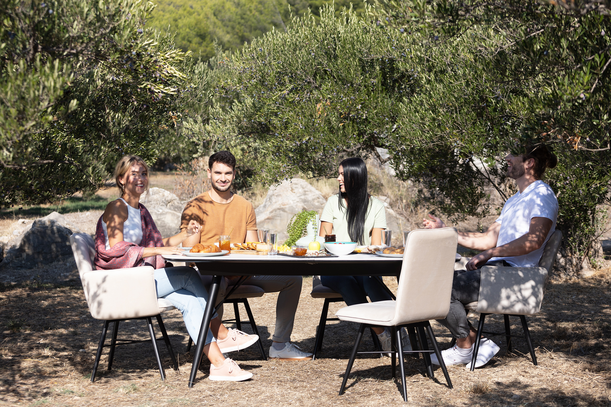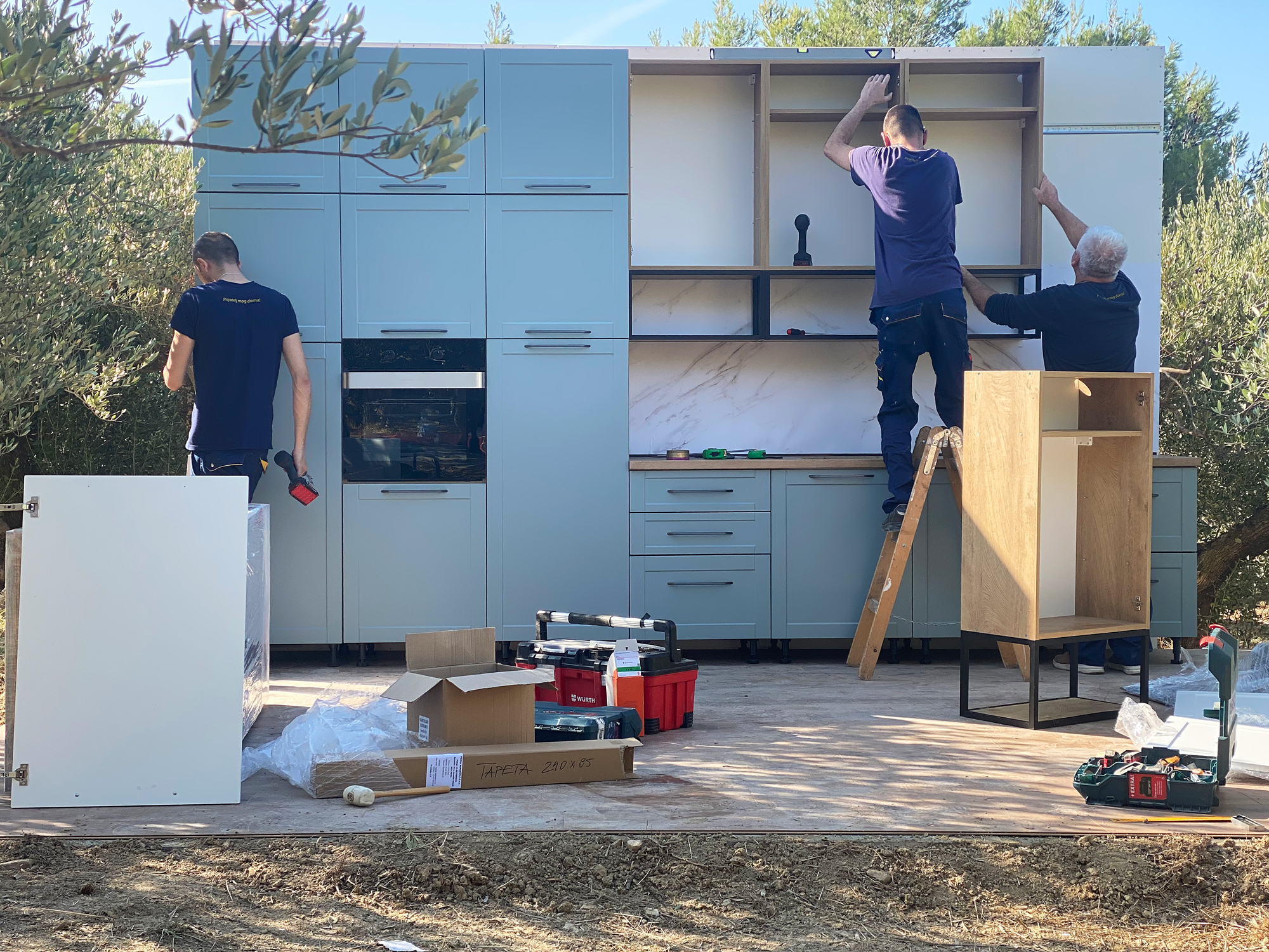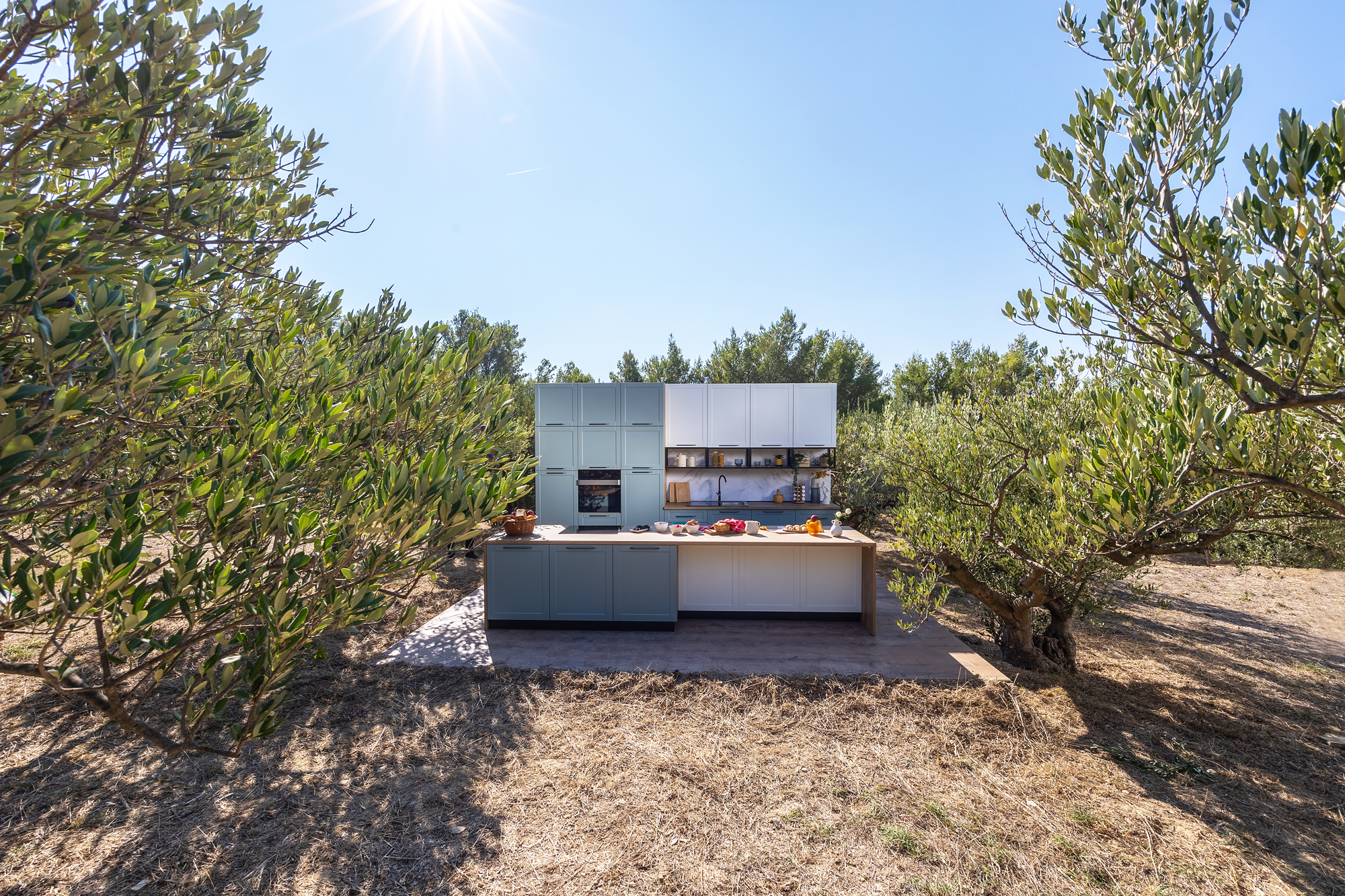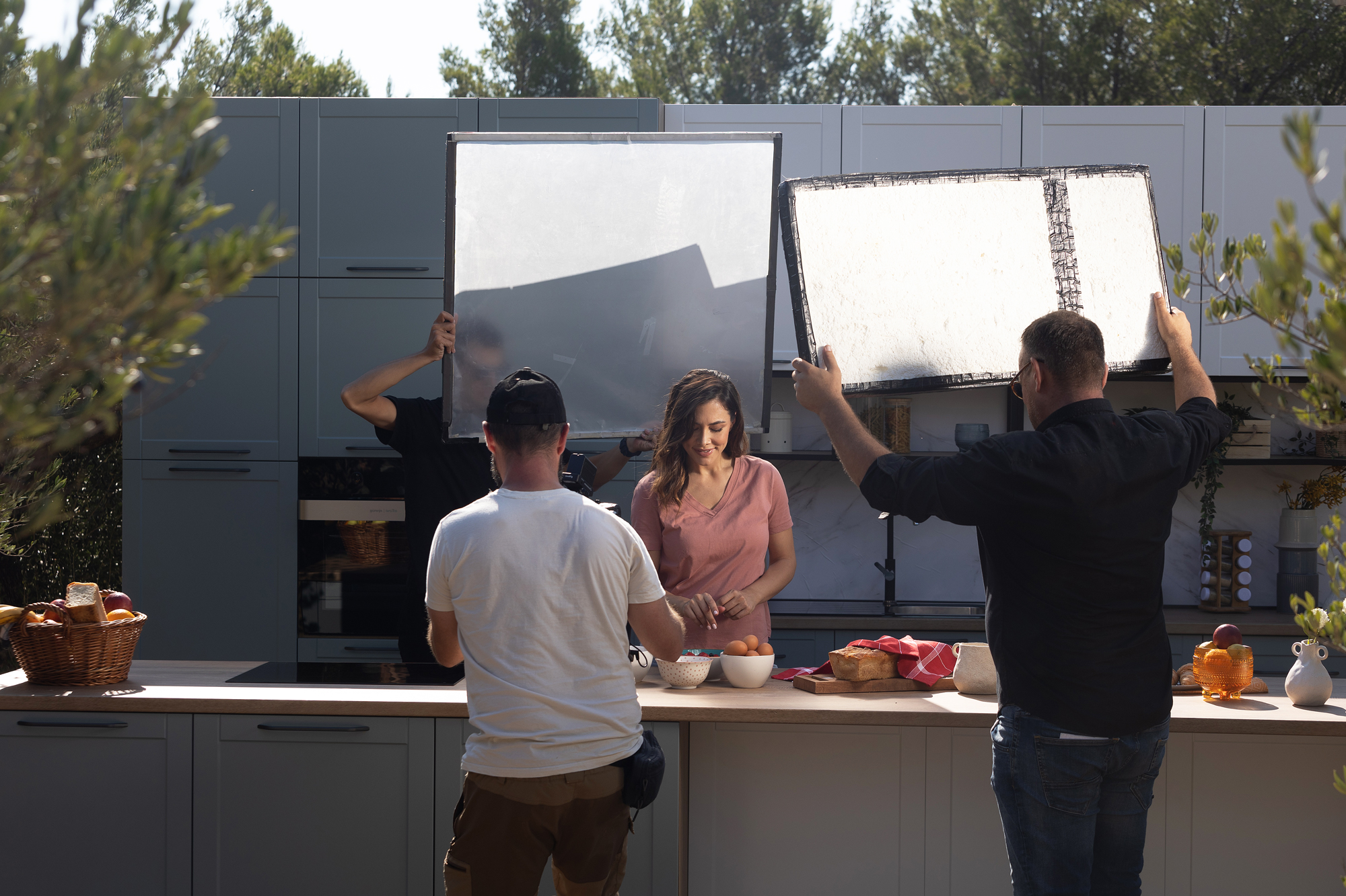 Prvi dan snimanja proveli smo u Podstrani, nedaleko od Splita, a prve kadrove za spot snimili smo u zelenom masliniku. Bili su to ujedno kadrovi s najviše ljudi jer se radi o scenama vezanim za kuhinju i blagovaonicu te uživanju u finim, organskim namirnicama, svježem kruhu i tek ubranom povrću. Naši vrijedni i snažni monteri usred maslinika su podigli jednu od najpopularnijih Prima kuhinja po mjeri, model Amelia s korpusom i frontama u fjord plavoj i bijeloj boji koja je izgledala kao da joj je baš tamo mjesto. Par metara dalje, smjestili smo Tarin blagovaonske stolice i Tarin Neo blagovaonski stol oko kojeg se društvo okupilo na doručku.