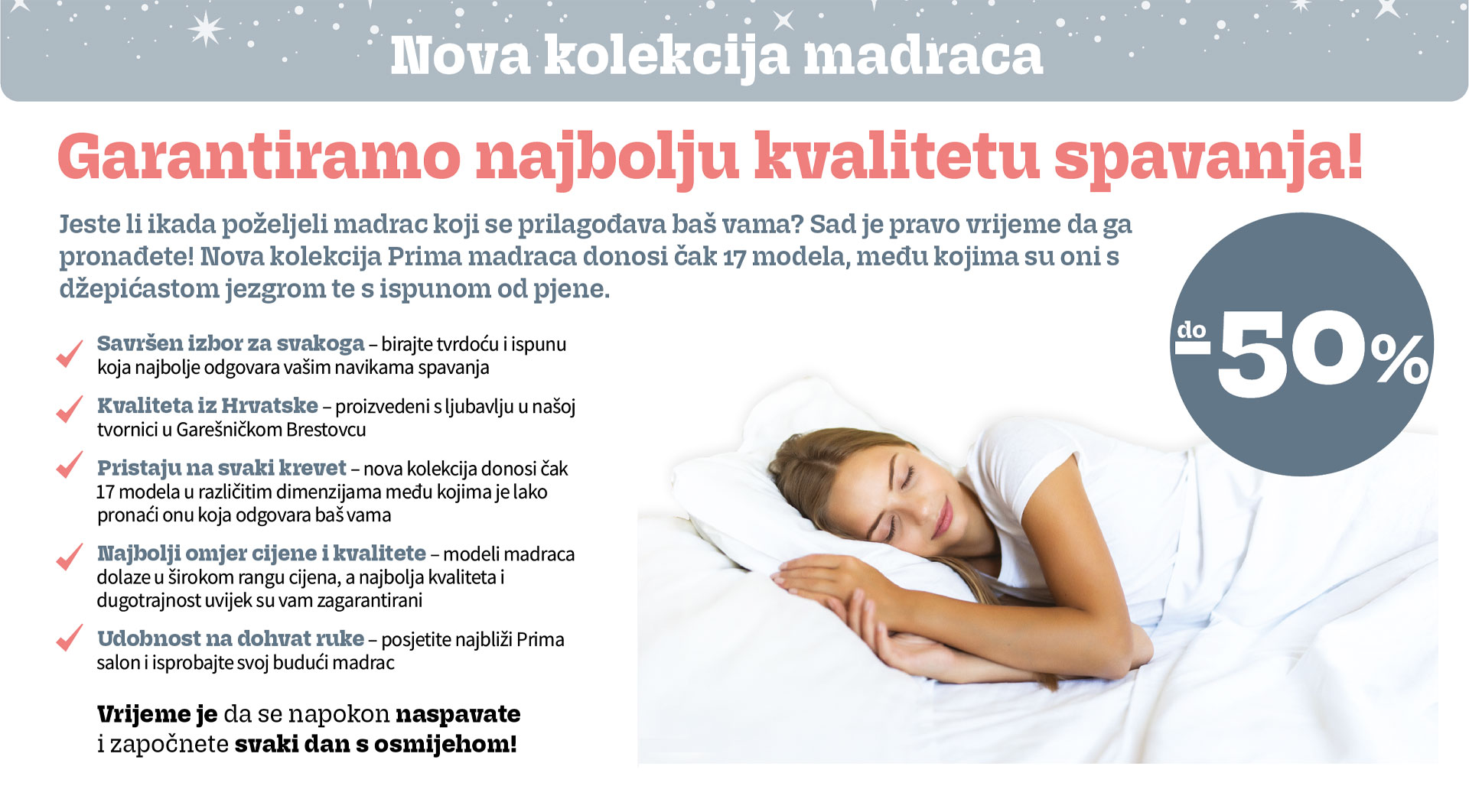 Kako biste pronašli najbolji madrac za sebe najvažnije je da isprobate njegovu udobnost prije kupovine. Svratite u najbliži Prima salon gdje vas čeka nova kolekcija madraca domaće proizvodnje koji su još kvalitetniji i još udobniji.