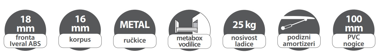 Fronte debljine 18 mm izrađene su od kvalitetnog iverala, što osigurava dodatnu čvrstoću i otpornost na svakodnevnu upotrebu, dok je korpus debljine 16 mm, što pruža stabilnu i pouzdanu konstrukciju.
