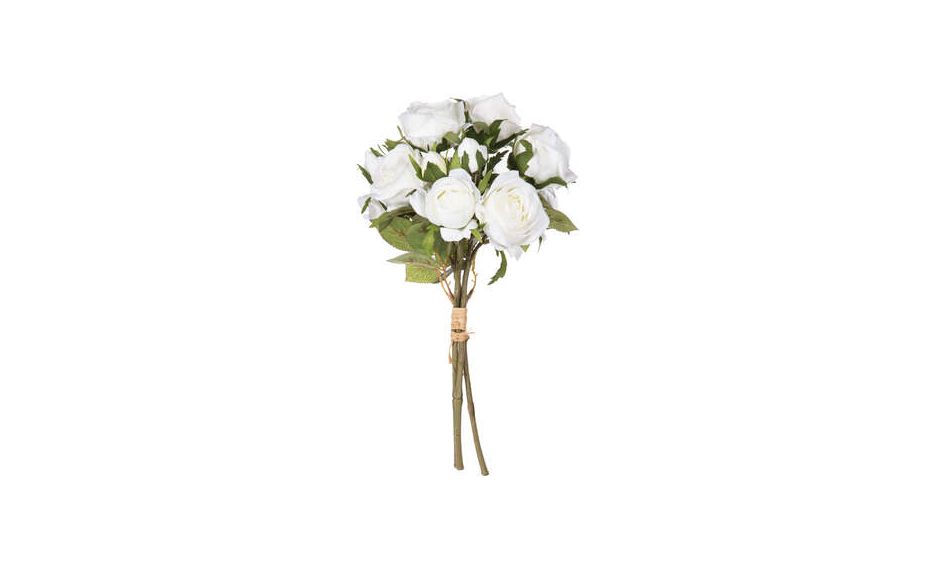 Umjetni buketi već se neko vrijeme vraćaju u modu, uglavnom zbog svoje jednostavnosti. Ovaj buket bijelih ruža može stajati u vazi kao samostalan ukras ili se može kombinirati s ostalim cvjetnim granama kako bi nastali jedinstveni cvjetni aranžmani. A ako ste oduvijek željeli kupaonicu punu cvijeća, ali je stalna vlaga i nedostatak sunca sprječavala rast cvijeća u toj prostoriji, sada taj problem možete riješiti upravo umjetnim biljkama koje savršeno podnose teške uvjete u kupaonici. Jedini uvjet u njihovoj njezi je jednom ih oprati blagim sapunom kako bi im se vratila boja i uklonila nakupljena prašina na cvjetovima – to je sve. Ovaj buket dugo će krasiti Vaše prostorije i u njih unositi svježinu. Izrađen je od poliestera i polietilena.