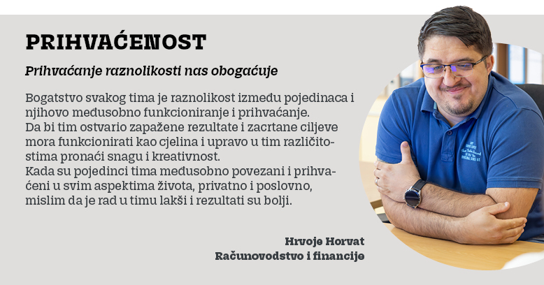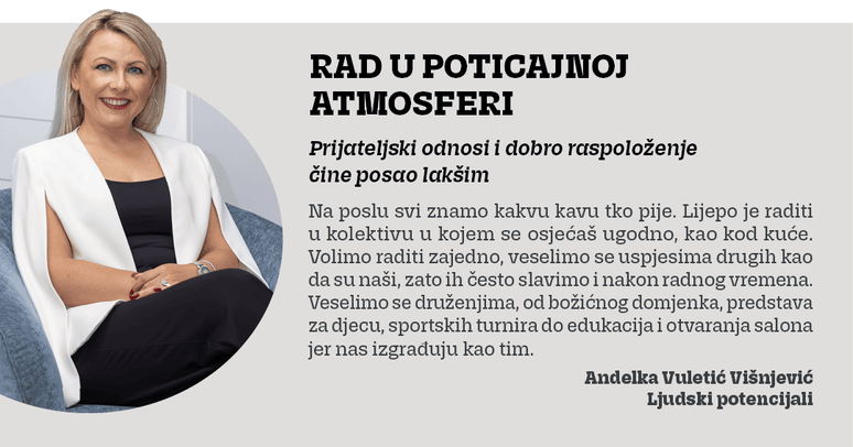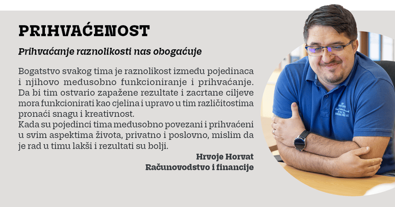 Suradnjom stvaramo nove vrijednosti a promjene doživljavamo kao izazove koji nas jačaju. Tu smo jedni za druge, potičemo se i podržavamo. Učimo jedni od drugih, a strast prema poslu nas vodi naprijed. U ovom okruženju možemo biti svoji, rasti i razvijati se.