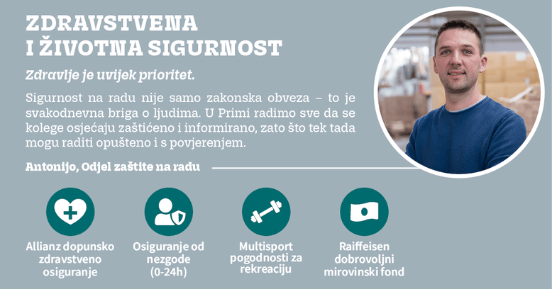 Zato našim ljudima pružamo više od posla – nudimo podršku, sigurnost i prilike za rast u svakom segmentu života. Od financijskih pogodnosti i ulaganja u razvoj, do brige o zdravlju i ravnoteži između posla i privatnog života – naši benefiti oblikovani su tako da svaki član tima osjeti vrijednost i pripadnost.
