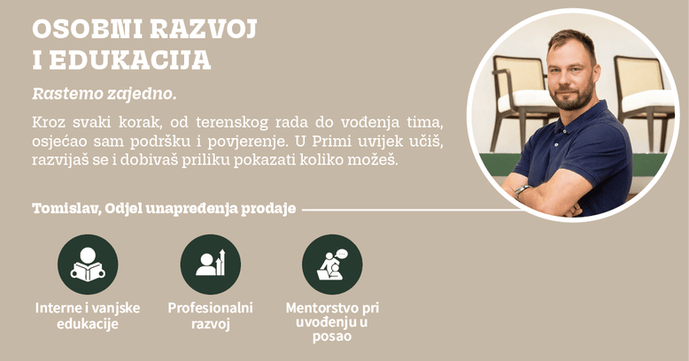 Prima grupa temelji svoj uspjeh na razvoju i težnji da budemo bolji na svim područjima i u svim aktivnostima. Da bismo to ostvarili, od naših zaposlenika očekujemo da se neprekidno usavršavaju u svom radu i da razmišljaju izvan okvira kako bismo u svakom trenutku mogli ponuditi rješenje za našeg kupca i zaista biti prijatelji njihovog doma.