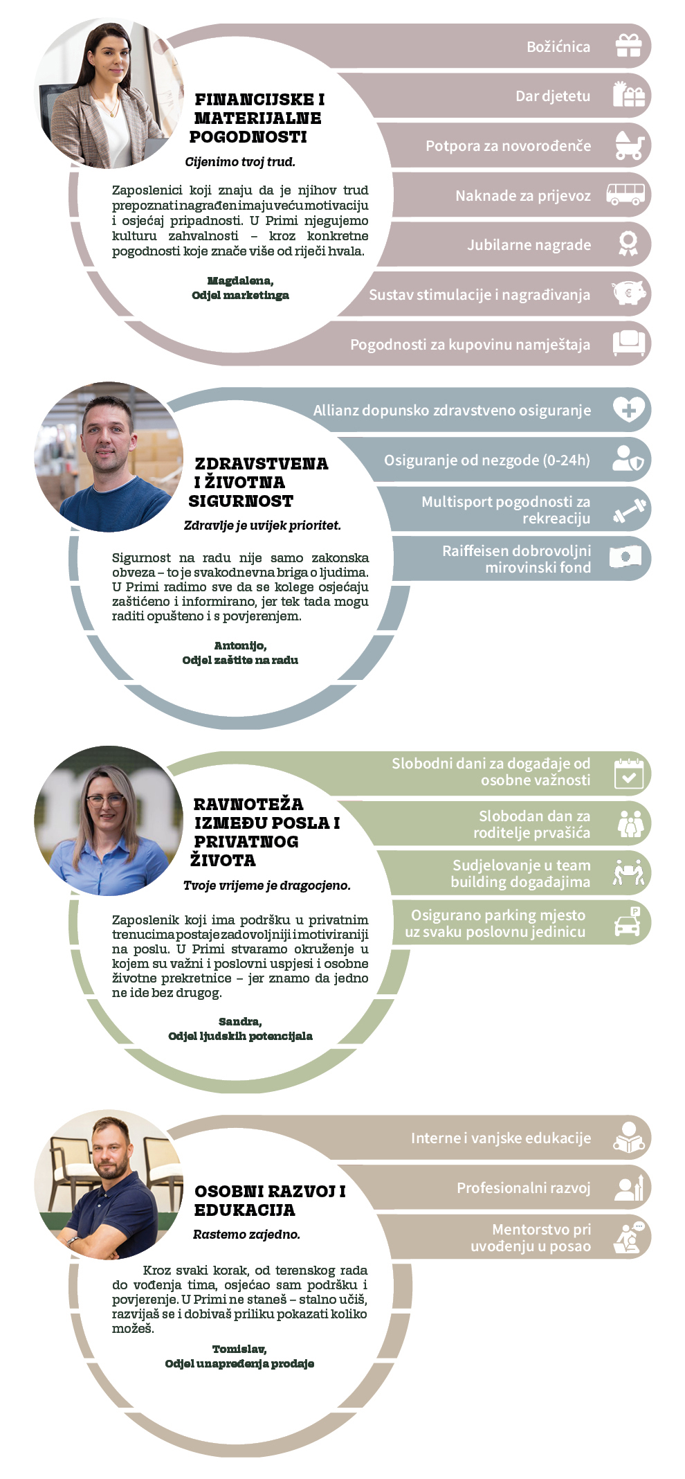 Prima grupa temelji svoj uspjeh na razvoju i težnji da budemo bolji na svim područjima i u svim aktivnostima. Da bismo to ostvarili, od naših zaposlenika očekujemo da se neprekidno usavršavaju u svom radu i da razmišljaju izvan okvira kako bismo u svakom trenutku mogli ponuditi rješenje za našeg kupca i zaista bili prijatelji njihovog doma.
