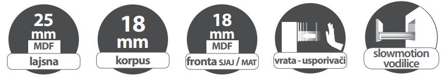 U sklopu predsoblja nalaze se ormarići za cipele, ormari s policama, komode, zidne vješalice i sastavi, koji omogućuju dovoljno prostora za pohranu obuće, jakni i modnih dodataka. Posebna pažnja posvećena je detaljima i kvaliteti izrade – elementi su izrađeni od oplemenjene iverice debljine 18 mm, što im osigurava trajnost i stabilnost.