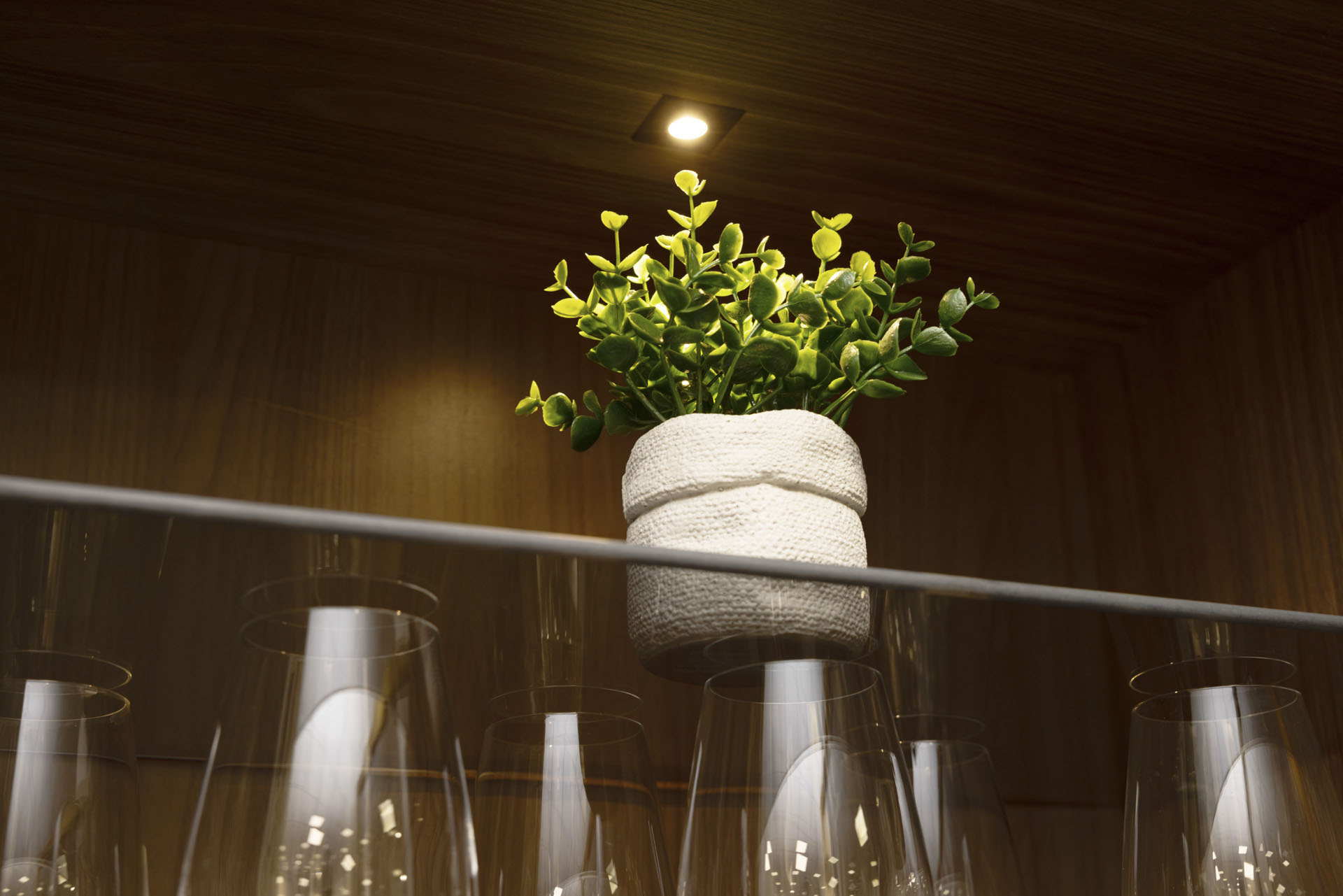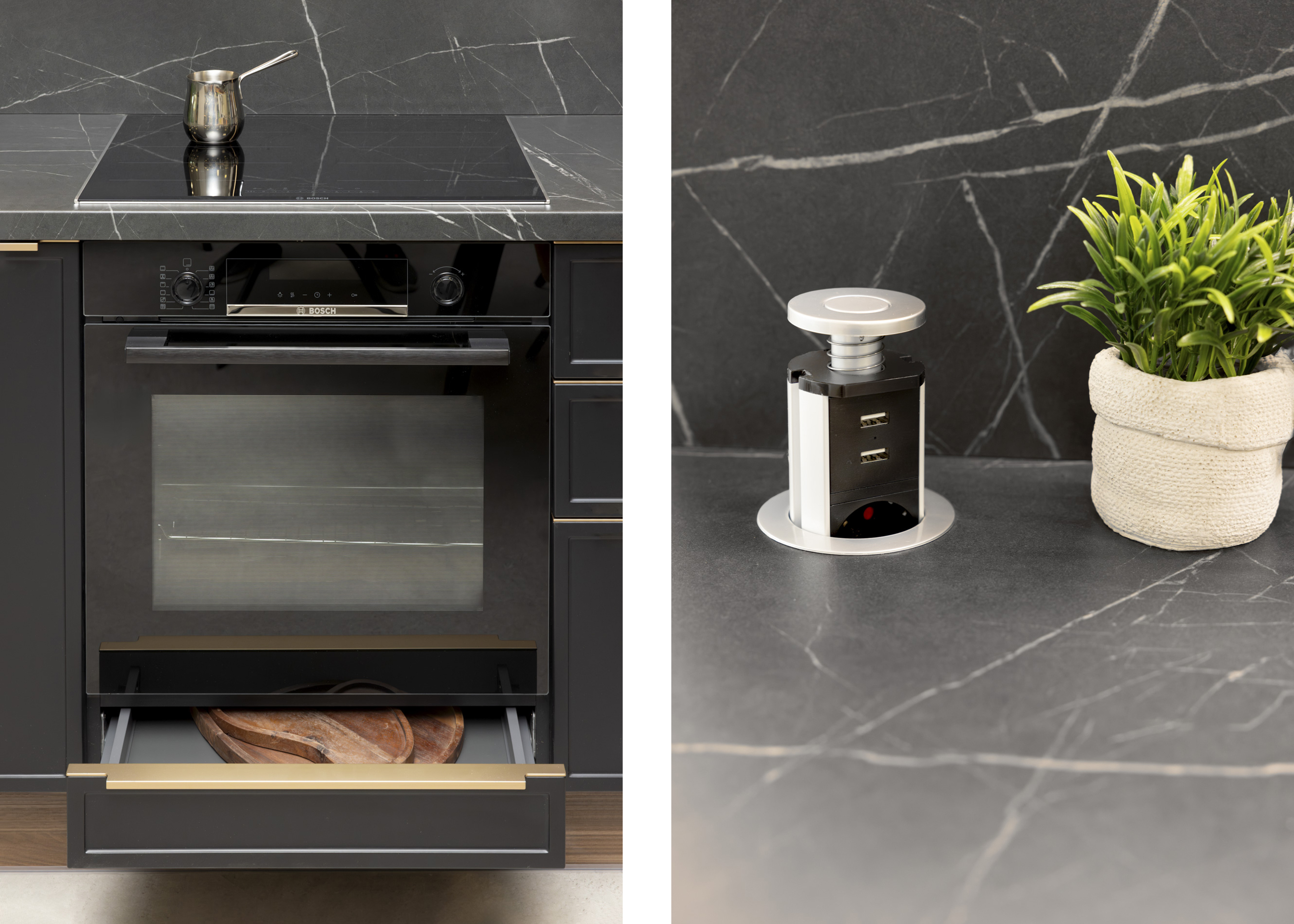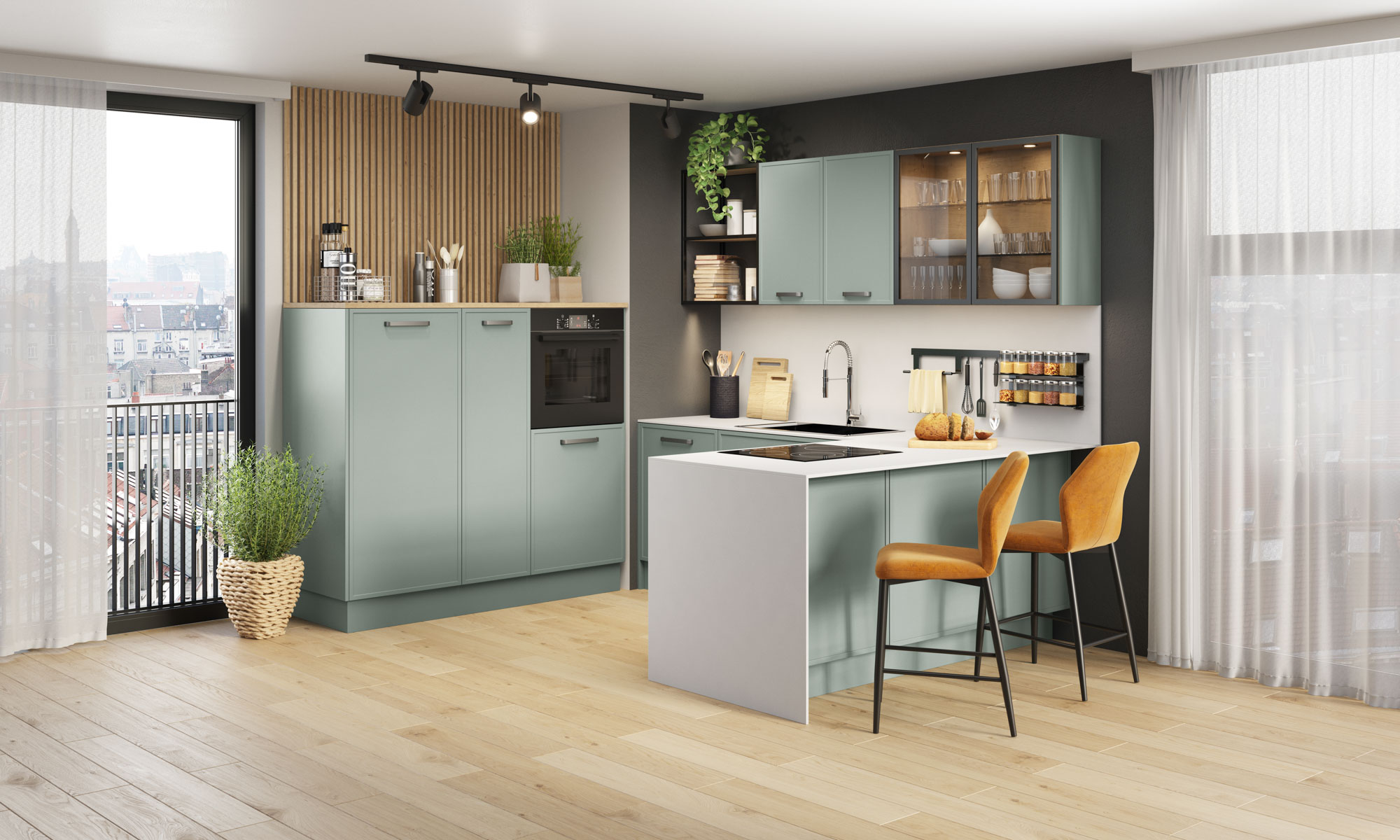 Moderna i profinjena kuhinja Linda ostavit će tvoje goste zavidnima. U njezinom je dizajnu puno pažnje posvećeno detaljima. Posebno su efektne fronte s okvirom, otvorene metalne police te staklene fronte s ugrađenom rasvjetom.